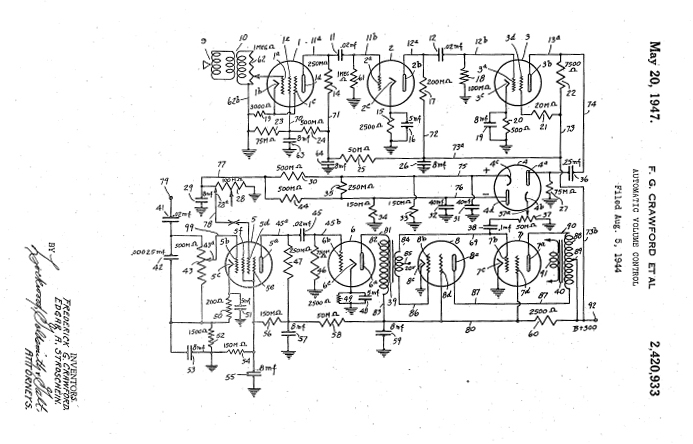 Wurlitzer's Technical Improvements in Sound Volume Equalizer Switches, Patent No. 2,221,977 Ambient Noise Compensator Patent No. 2,420,933 Key Operated Master Volume Control Click to Enlarge Click here if you want to learn how to get Patent Drawings By contrast, Rock-Ola and Seeburg tried to provide very high quality sound by designing amplifiers with bandpass filters that separated the sound spectrum into high, mid-range, bass and even sub-bass frequencies and routed them to appropriate speakers. The large electrodynamic speakers continued to provide midrange. A new creation, the tweeter was used to reproduce the high frequencies. At the other end, the woofer and sub-woofer speakers were used to reproduce the air-movement associated with very low tones. High frequency sounds are directional, and a variety of systems were used to get the tweeters high and facing the room. Lower frequencies are less directional, so the woofer was located at the bottom of the machine and often used the cabinet space to make the sound even fuller. The sounds produced by the subwoofer are completely nondirectional and this speaker was often aimed at the floor. The 1941 "Spectravox" from Rock-Ola had a bowl-shaped enclosure for the tweeters on top of the box that made it look like the altar of a Greek Temple. Rock-Ola also combined the upward-firing tweeters with its popular light-show "Commando" to create a very distinctive machine.