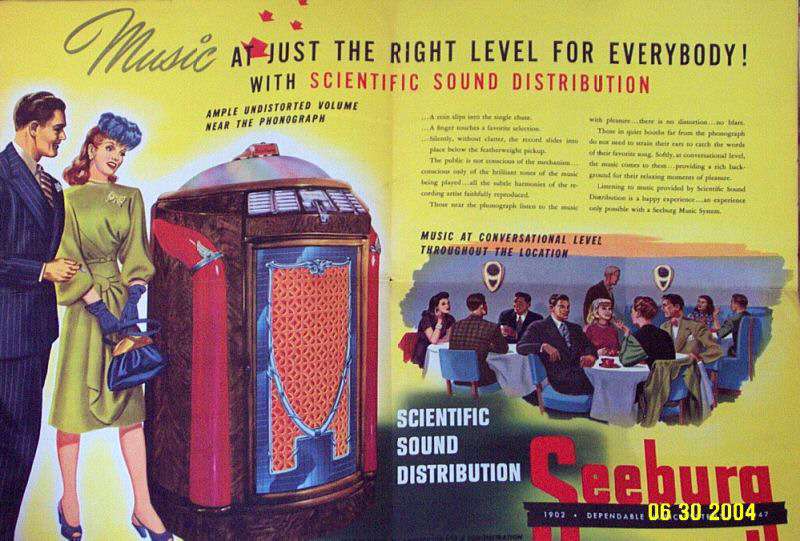 High Fidelity Comes to the Jukebox Ad for the Rock-Ola Spectravox Rockola Commando Jukebox Equipped with Tweeters The Seeburg Model 9800 "Super High Fidelity" Jukebox Speaker Array in the Seeburg 9800 Jukebox Click to Enlarge Seeburg was probably the greatest promoter of hi-fi sound. Below is an ad in which they promise to have the music loud enough for dancing near the machine but at "conversational Levels" at the tables. They accomplished this with a mixture of the speakers shown above in the machine, proper, plus remote speakers in the dining area.