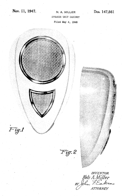 Seeburg Scientific Sound Distribution Remote Speaker, Design Patent D-147,861 Click to Enlarge Click here if you want to learn how to get Patent Drawings I can honestly say that in my entire history of listening and dancing to juke boxes in the 1950s or today, I have never paid any attention to the sound quality as long as the music was loud enough. I suspect that Wurlitzer had the best business plan -- give them glitz not hi-fi. And that brings us to our next topic: Jukebox design. Design ConsiderationsAs we have seen above, the design of the jukebox was intimately linked to its function. The number of selections influenced the vertical dimension, the speaker arrangement required certain volume of cabinetry and the width of the human finger conditioned the selection apparatus. As we will see below, these constraints resulted in a lot of commonality between the various makes of jukeboxes They started out as furniture. They were nicely crafted from mahogany but they were boxes nonetheless. Below are machines from Seeburg, AMI and Wurlitzer from theperiod 1928-1930. You'll note that they are made to look like nice, tasteful furniture -- they do not "shout out" to the customer.