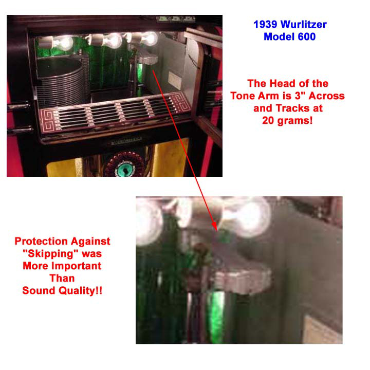 Sound Quality took a Backseat to "Skip" Prevention Tone Arm for a 1939 Wurlitzer Model 600 Jukebox Patent Showing Relative Size of Jukebox Tone Arm (No. 2,371,491) If you danced to "In the Mood" you did so without the high notes... Click here if you want to learn how to get Patent Drawings During the "Golden Age" of jukeboxes (from 1930-1950), Wurlitzer's sound system was a five tube amplifier and a large electrodynamic speaker.