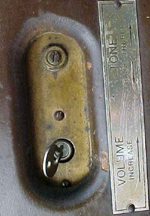 Wurlitzer had the "Plain Vanilla" Sound System Electrodynamic Speaker - Patent No. 1,808,149 Wurlitzer sound quality was about as good as on the well-worn 78s... Click to Enlarge Click here if you want to learn how to get Patent Drawings Wurlitzer did a small amount of work in the area of sound. They developed a scheme for equalizing the volume across records. During the 1930s and 1940s, 78 rpm records were notorious for different sound levels in recording. Settings that were "too loud" for some records resulted in barely audible sound from other records. Wurlitzer took the "low-tech" approach -- there were individual volume control levels available for each record. Late in 1947, Wurlitzer developed a circuit to allow volume to keep pace with the level of ambient sound -- if the place was quiet, the volume would be relatively low; as the room became noiser, the volume would be increased. This circuit made sure that the customer got to hear his music! Finally, we have a picture of the master volume control for most Wurlitzer machines -- the basic volume could only be changed with a key!