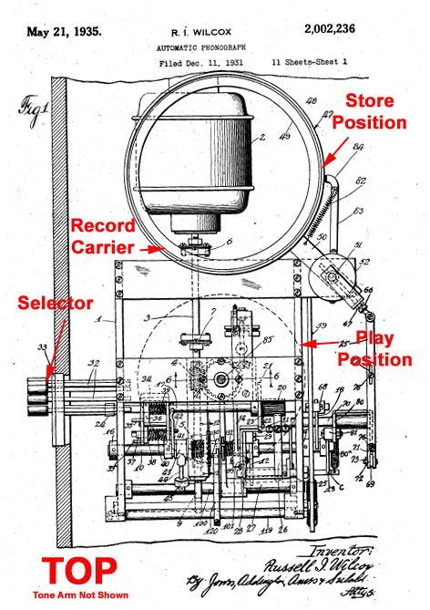 "Ferris Wheel" Playback on the Seeburg Audiphone Circa 1928 Click to Enlarge This "Ferris Wheel" technology was very short-lived. For this example, we have selected the Wilcox techique as a "typical" representative of the mechanism in jukeboxes of the 1930s. Before we get into diagrams and drawings, please take a look at this video of the changer mechanism on a Wurlitzer Model 1015 (ca. 1947). The song is "Swanee" by Al Jolson. Concentrate on how the record is handled and played, and then have a look at the diagrams below.