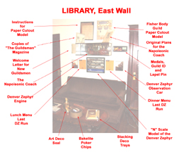 Click to Enlarge Apart from the Roosevelt memorabilia discussed above, the South wall holds a pair of snowshoes that were used by the U.S. Army mountain divisions during World War II. Click to Enlarge A model of the famous Central of New Jersey Blue Comet train is displayed above the door on the South wall. The East Wall Click to Enlarge The East wall is dominated by our display of a Napoleonic Coach that was constructed for a national competition. A 14 year-old built this from scratch, devoting almost 2,400 hours to the task which included working with wood, leather, cloth and glass as well as casting metal. We have a rather detailed page on the Fisher Body Guild, sponsor of the contest. ![]() The Fisher Body Guild One Twelfth Scale Napoleonic Coach Basically, Fisher Body, the styling division of General Motors used the contest to find new talent. The prize was a complete 4 year scholarship and a guaranteed job at Fisher. At the bottom of the Depression, this must have been a very powerful incentive. Thousands of boys submitted models. The guild was an amazing organization -- you should look at the web page we have prepared about it. This was good publicity for GM and boys loved it. The contest was so successful that in later years, GM came out with a paper cutout version for boys as young as 8. If you didn't win the contest, you got a swell magazine called "The Guildsman" that kept you up to date with all the new developments at GM. Below the Napoleonic Coach is our "N" scale model of the California Zephyr, commemorating our ride on the portion of it that survived the change to Amtrak. Our "N" Scale Model of the Californi Zephyr Click to Enlarge The Rio Grande railroad initially opted out of Amtrak and continued to operate its section of the former California Zephyr as the Rio Grande Zephyr. I was privileged to ride this train in the Spring of 1981. The ride was spectacular and the food was nothing short of fantastic. Here are the menus from that particular run: