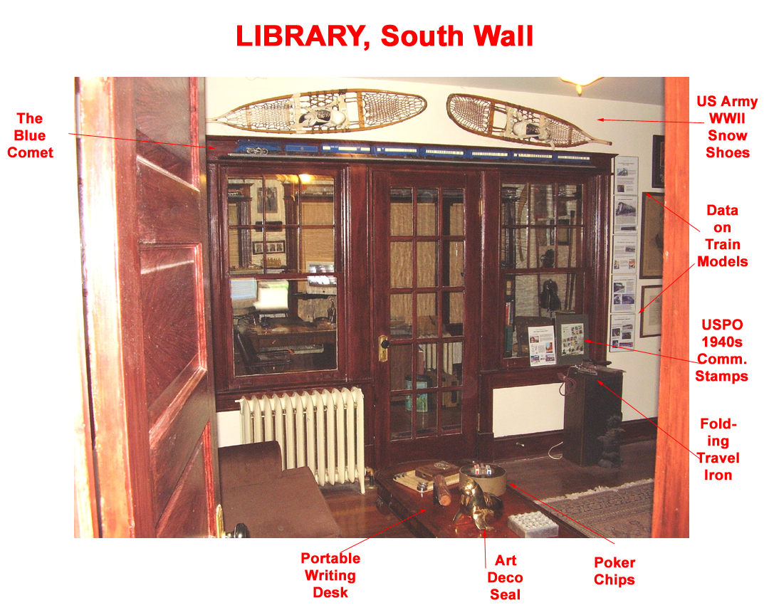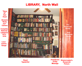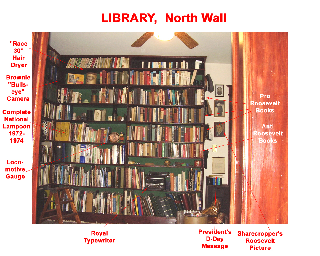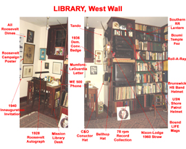 The Library began life as just another bedroom. I added the shelves in the 1970s. The room is not real mahogany -- if you look at our Faux Graining Page you can see how the job was done. We'll start at the North Wall (top of the diagram above) and work around the room counterclockwise (West, South, East...) The North Wall Click to Enlarge The North wall is almost entirely bookshelves. I have arranged my collection of materials on the New Deal, with all the "Pro-Roosevelt" books in one place and the "Anti-Roosevelt" books on another. There are books by almost everyone who ever met Franklin Roosevelt, including cabinet members, generals, admirals, ambassadors, ralatives, congressmen, political bosses,secretaries, and even his bodyguard. After reading this mass of material, I still have no idea who Franklin Roosevelt really was. He seems to be all things to all people. If you disliked him, he was the quintessence of evil. If you liked him, he was a saint. I still can't decide whether the New Deal worked or it didn't. On sober reflection, it cost about a trillion 1944 dollars to fix the damage that bankers and speculators did to the economy in the 1920s. The problem is that the trillion was spent on World War II. From the perspective of the Serious Recession (Ha!) of 2009, I just hope that we don't have to fight World War III to fix the damage done to our economy by the bankers and speculators. For some folks, Roosevelt was more than a man. One of my dearest possessions is a picture of FDR in a cheap tin frame. We were driving through the south and saw an abandoned sharecropper's house. We stopped and peeked inside. Amidst the shambles, this Roosevelt image was hanging on the wall. To some, FDR was the only hope they had. In my own family, I can recall that almost all my relatives got some form of "relief" during the Depression. After WWII, when things picked up, I watched each one of them move to the suburbs and start complaining about "Big Government". On a somewhat lighter note, I also have a complete set of the National Lampoon from 1972-1974 (when it was funny and not just dirty...) The West Wall Click to Enlarge The West wall of the library is devoted to books on World War II, something that is essential, I believe, to the evolution of American society in the 1950s and beyond. The geopolitical decisions that were made, particularly in the Middle East, affect us directly today. The sacrifices, frustrations and aspirations of the men and women who fought the war shaped our thinking (positively and negatively) until the turn of the century. It is only now that a new generation free of the conflict between the WWII Generation and the Baby Boomers can begin to evolve a new society. The West Wall also contains our bound issues of LIFE magazine from which many of our observations about the 1940s spring. A curious item called a Roll-a-Ray sits on one shelf. It is a sunlamp on wheels. Although it looks innocuous, during the 1940s and 1950s it was widely touted to the unsuspecting as a cancer cure. We have a large collection of funny hats to go with all our dance costumes. Do you need a Train Conductor for your next party -- we picked up a complete C&O conductor's uniform. The "Nixon'Lodge" straw hat is from the 1960 presidential campaign. We have a collection of materials related to FDR, including several autographs, acalling card from the Governor's mansion in Albany, a framed collection of all the siver Roosevelt dimes, an invitation to the Innaugural Ball in 1941, and a convention delegate's badge from 1936. Our treasured autograph is a letter from Fiorello LaGuardia to Lewis Mumford requesting that he write a History of New York City. The South Wall Click to Enlarge The South Wall is largely a doorway to the Office. The presence of the windows is a result of the choice of the owners to "accessorize" the house by adding two "Sleeping Porches" (#102 in the Catalogue): the East version had a three window room on the second story with a pantry/porch on the first; the West version had two three window basy on the first and second floors. Thus, the windows in the library are to provide light and ventillation into what would have been an interior room.