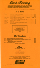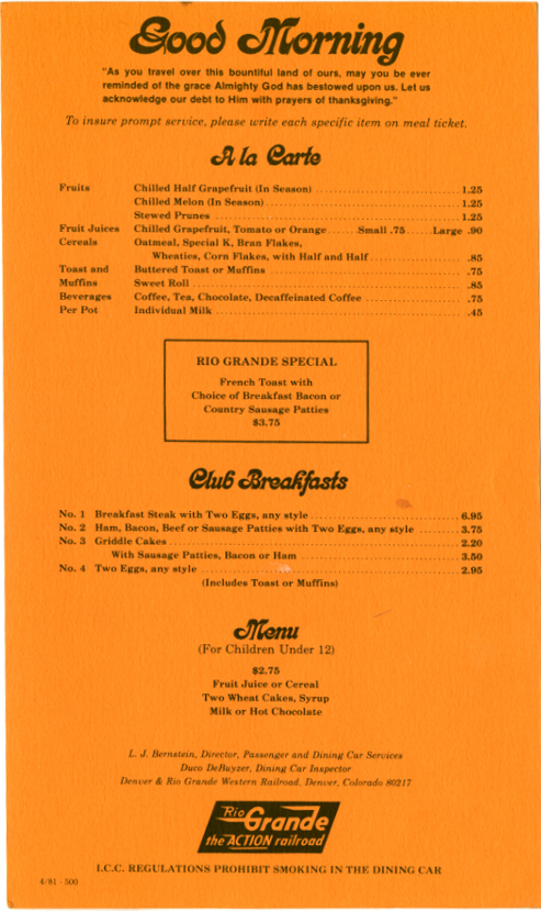 1981 Breakfast, Lunch and Dinner Menus for the Rio Grande Zephyr Click to Enlarge I have scanned the photos that I took in 1981 and made up a Special Slide Show to show the cars, staff, stations, and scenery from that trip. You can check out the full history of the California Zephyr on our Streamlined Locomotives Page. This completes the Library. Where would you like to go next? The First Floor