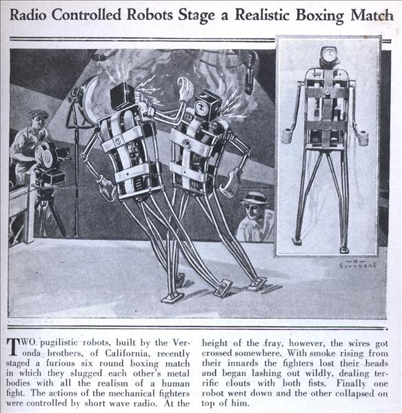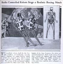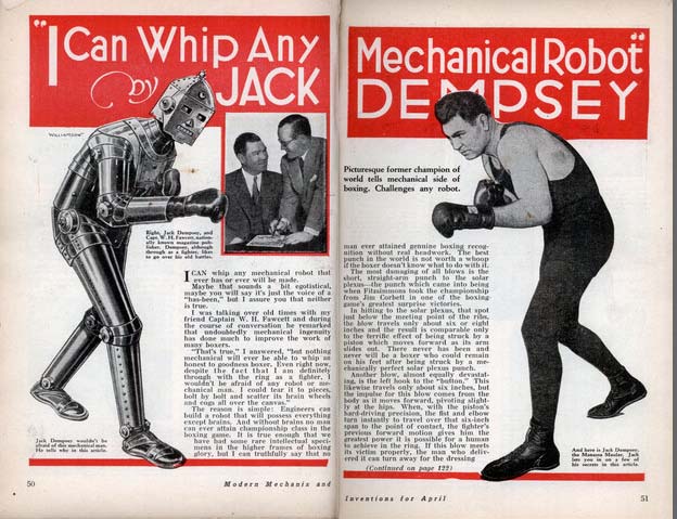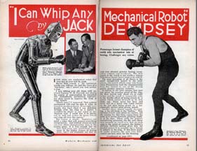 ![]() Jack Dempsey was certainly not averse to publicity! Below, you'll find him willing to take on any "Boxing Robot." He is responding to an article in the January 1931 issue of Modern Mechanics which reports a boxing match (to the death, apparently) between two "short-wave controlled robots". In the April 1934 issue of the same magazine, Dempsey offered to take on any and all robot comers. IN THIS CORNER, THE BOXING ROBOTS!