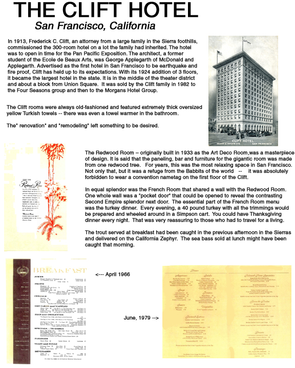 ![]() Join Us on Facebook After a whole lot of organizing and scanning, I'd like to share my menu collection with you. The principal criteria for listing a restaurant are: (a) I actually ate there; (b) I was able to beg, buy or steal the menu; and (c) the restaurant had to be part of the glamour of the Swing Era or be located in an Art Deco building Before we move on (and to accomodate folks coming in from Search Engines with a specific purpose), here is a list of the establishments covered on this page. Each restaurant has a brief description illustrated by pictures, graphics, etc. After that, you'll have the opportunity to download a full-size copy of the menu. After the presentation of the restaurants, I have included a Glossary of my experience with Menu French, something that may help you if you ever get stuck in a snooty tourist trap. BUT WAIT! THERE'S MORE! For your pleasure, I offer my Handy-Dandy Inflation Adjuster which should help put some of those prices from the 1950s into perspective. Here are Your Options