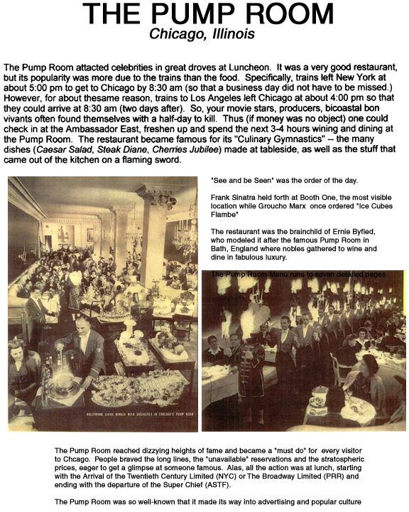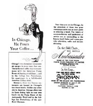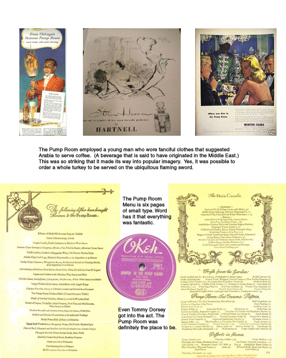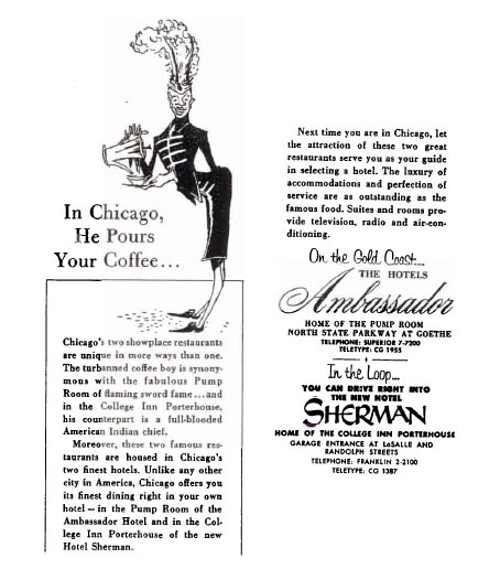 ![]() ![]() This ad ---from the October 17, 1955 issue of TIME Magazine --- shows that the turban-clad coffeee server (note the use of "boy" in the non-PC 1950s) had become a very recognizable icon of the Pump Room. ![]() Click Photo to Enlarge It I am looking for photos of the College Inn Porterhouse and especially the Indian Chief (another non-PC icon) serving coffee. By way of reference, the Hotel Sherman was one of Chicago's premier night spots attracting celebrities, tourists, and members of high society. It was during this period that the College Inn restaurant (later, the College Inn Porterhouse), with the help of band leader Isham Jones, became a notable jazz venue. Jones broke with the genteel tradition of violin-based hotel performance when he replaced many of his orchestra's waltz-oriented numbers with new, jazz-inspired tunes. Though the tunes played by Isham Jones and his all-white jazz orchestra were tame in comparison to those heard in the racially mixed cabarets of the South Side, they nonetheless gave many white Chicagoans their first taste of jazz. To be sure, the College Inn was an especially important fixture in Chicago's growing jazz scene. There, amid the refined surroundings of the Hotel Sherman, jazz sounds migrated from the city's African-American neighborhoods into the center of white society. INSTRUCTIONS | |