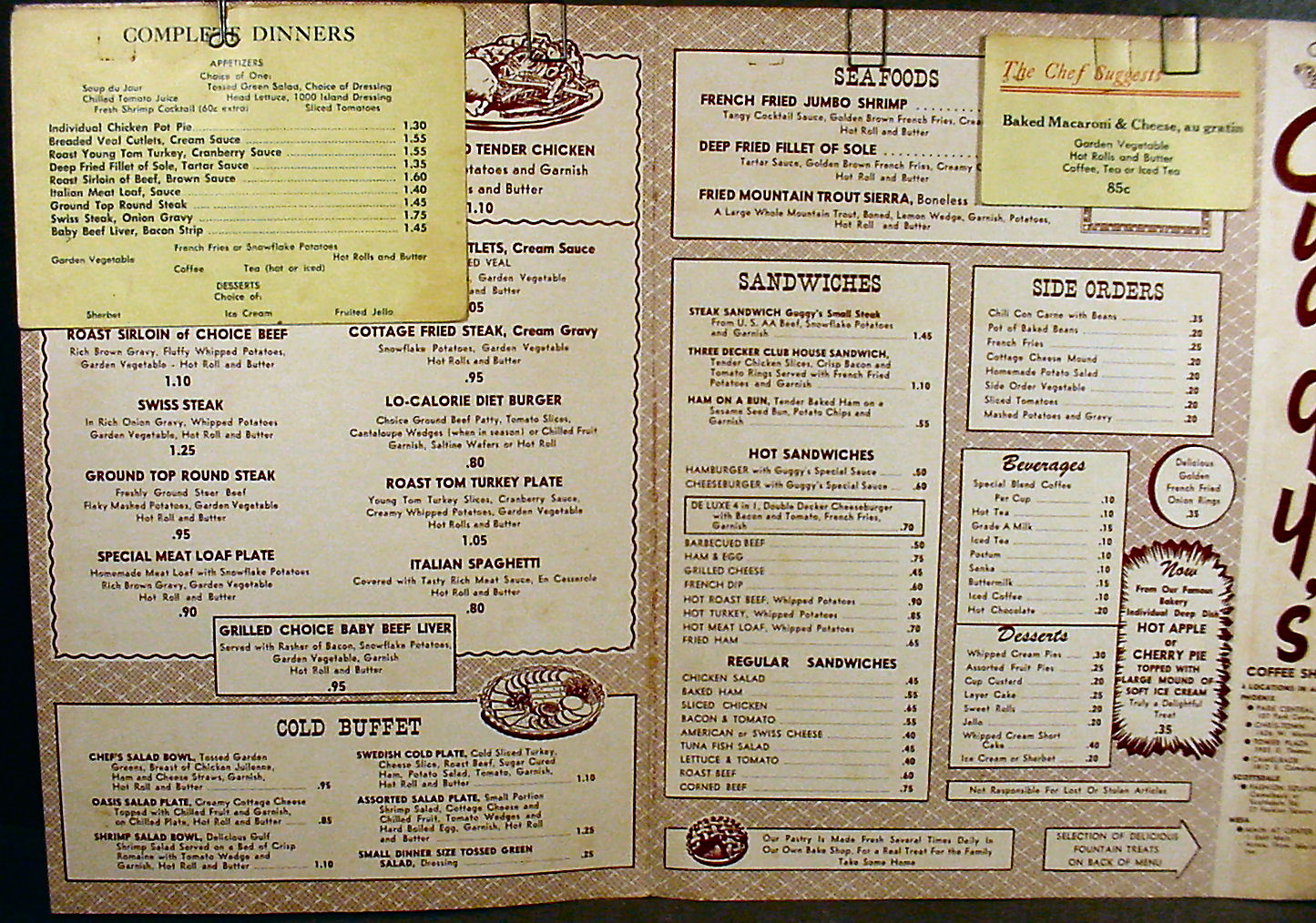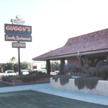GUGGY'S COFFEE SHOP, Phoenix, ArizonaWE are indebted to our good friend "Acme Ron" Heberlee for sending us a scan of the menu from Guggy's Coffee Shop in the old Chris Town Mall. Apparently, there was a slightly more upscale branch located in the Scottsdale Fashion Mall. (Both malls have definitely seen better days, we are informed...) ![]() Exterior of one of the Guggy's Coffee Shops Click Photo to Enlarge It The flagship restaurant of local chain Goog’s opened on 18th Street and Camelback Road in 1962. Goog’s and its sister chain, Guggy’s, were renowned for their Pink Champagne Cake (which lives on at Victorian Cake Company), but the restaurant on Camelback closed in 1990; it’s now an Arriba Mexican Grill