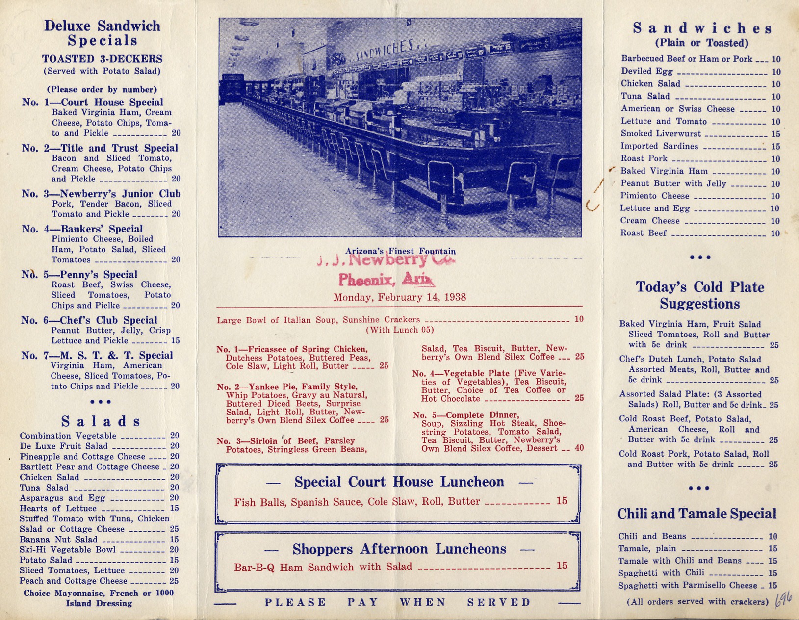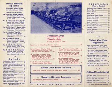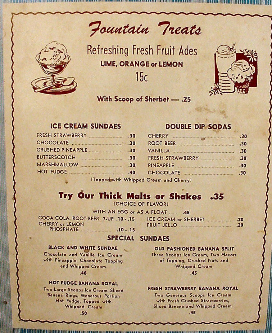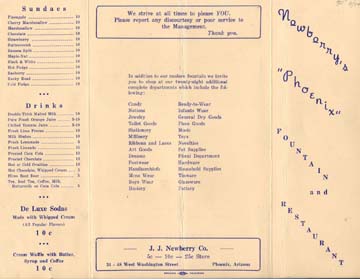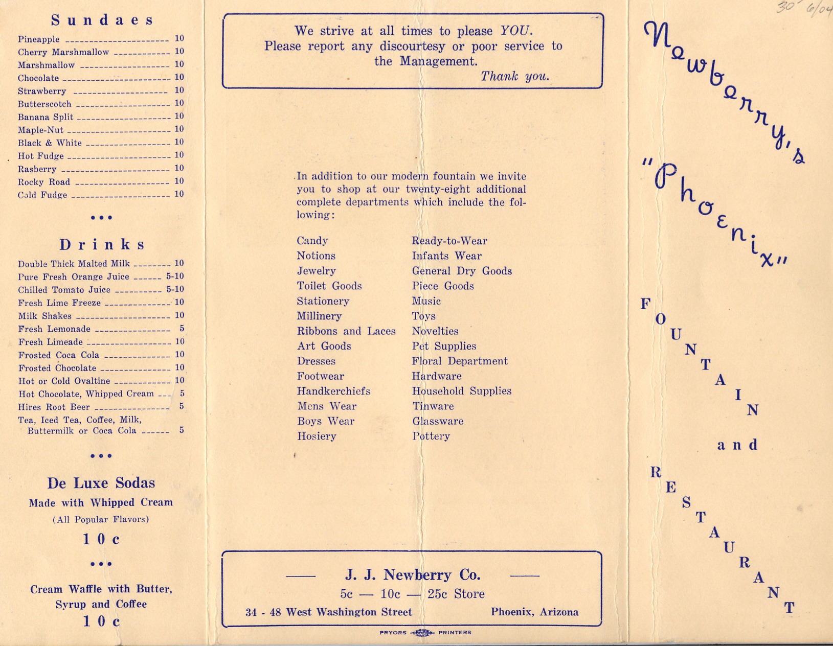 Phoenix, Arizona Thanks to our friend "Acme Ron" from Phoenix, we are now able to take you to Newberry's, a general merchandise store akin to the 5 and 10 stores with a block long soda fountain. Before the days of fast food chains, you could find several of these on Main Street in every town in the US. Here is a photo of the Newberry Store. Eventually, the J.J. Newberry company was taken over by McCrory's (a 5&10 chain) The last Newberry store closed in 1997. ![]() ![]() Click Photo to Enlarge It The Five and Ten soda fountain was such an entrenched part of American life that the Modern Civil Rights movement got started at a Woolworth soda fountain, not a fancy black tie restaurant. This really was America, warts and all. Thanks to our friend Cheryl, we also have a menu from a Woolworth's store, probably from the mid-to-late 1960s. It was the principle, not the food that was in contention. ![]() Click Photo to Enlarge It ![]() INSTRUCTIONS | |