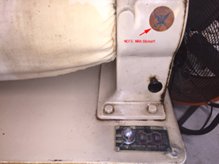 New Old Stock Conlon Ironer Click to Enlarge Recently, we got some photos of a Conland Ironer from 1933-1935. We can date it because it has a sticker showing that it was made and sold under the National Industrial Recovery Act ( The famed "Blue Eagle" which indicated that the machine had been made and sold with fair trade. The Act was passed in June of 1933 and struck down by the Supreme Court in May of 1935, so this machine can be dated with some precision. The photos were sent to us by Glenn in South Carolina. He writes: "... I was searching for information on a Conlon Rotary Iron I pulled out of my grandmothers house and found your website. ..."