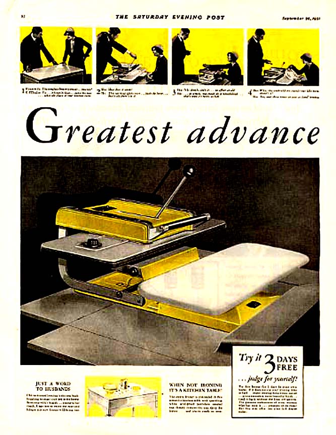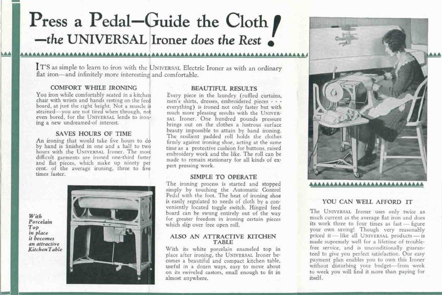 General Electric Ironer Click to Enlarge Here is an ad for the General Electric Ironer that was displayed on NYC Subway trains in the 1930s and 1940s. ![]() Subway Advertising Card for the GE Ironer This was on our Nostalgia Subway Ride, Christmas 2008 Click to Enlarge The Universal Ironer These photos were sent to us by our friend Lorena. She has a "Universal" ironer that seems to have survived fairly well. "Universal" was the name used for products made by Landers, Frary and Clark of Connecticut, and we have a detailed history of that company on our Coffee Page, largely because LF&C was catapulted to fame by manufacturing the first percolator.