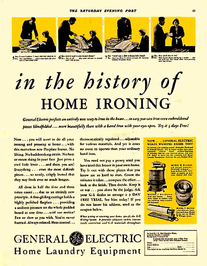 General Electric Flatplate Ironer Click to Enlarge In the 1930s, General Electric gave up the flat-plate ironer and made a roller version that competed with the Ironrite.
