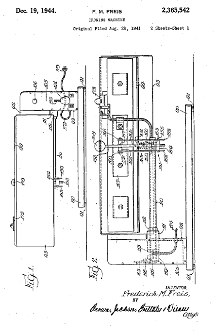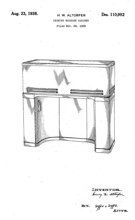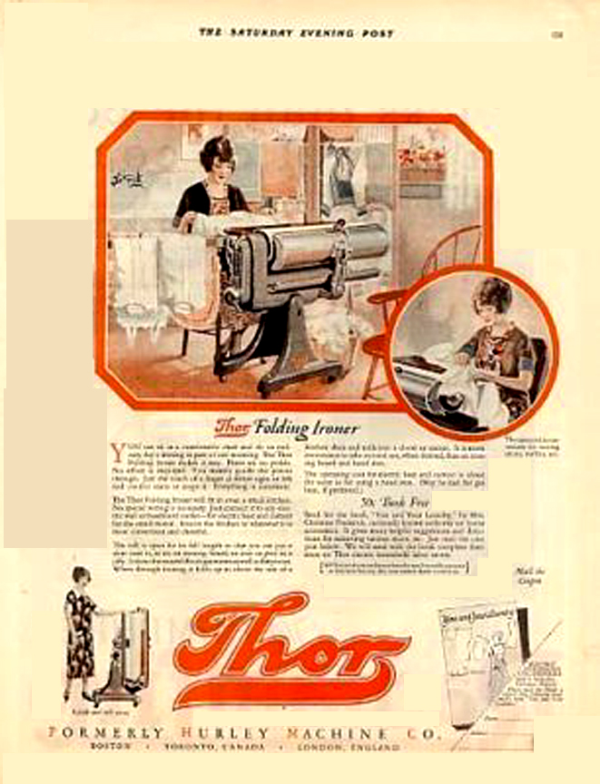 ![]() The ABC Ironer LEFT:List of ABC Patents RIGHT: Henry Altorfer's Design Patent (D 110,992) for the ABC Ironer Exterior Click to enlarge The ABC Ironer and the Atomic Bomb We'd like to report that J. Robert Oppenheimer made the detonator for the Hiroshima bomb out of parts from an ABC ironer. Exciting as that might be, it would be false. BUT, the ABC Ironer did play a critical part in the Manhattan Project. Specifically, we found the following photo of the laundry room at the Los Alamos facility. Here you see the wives of the scientists pressing forward keeping the shirts, tablecloths and sheets well-ironed. The do not, however, have the benefits of an ergonomic "Health Chair"as afforded owners of the Ironrite. Some sacrifices were necessary during wartime. ![]() The ABC Ironer at War! If you would like to see more photos of day-to-day life of real people who worked on the Manhattan Project, check out the website of the Manhattan Project Heritage Preservation Association. The Thor Gladiron Ironer The Thor line of washers and ironers was an incidental offshoot of a company founded near the turn of the [20th] Century by John D. Hurley, and two Cleveland [OH] politicians. To inspire confidence, Hurley induced "Diamond Jim" Brady,the nation's best known salesman of railroad products to allow his name to be used as President of the fledging company. The reason that Brady was brought on board was that the first Thor product was a pneumatic hammer to pound rivets and drill holes for bolts used to fasten the fire box of a locomotive to its boiler. Railroads soon became the major customers of Thor pneumatic products. ![]() Thor Wielding His Hammer Thor was the mythical god of thunder, frequently pictured as wielding a mighty hammer. Hence, The name "Thor" was applied to the company's pneumatic hammer. The name acquired a reputation for quality and dependability and spread to other Thor products.