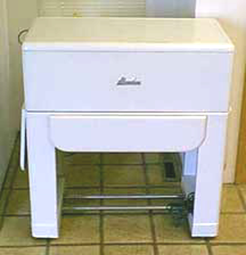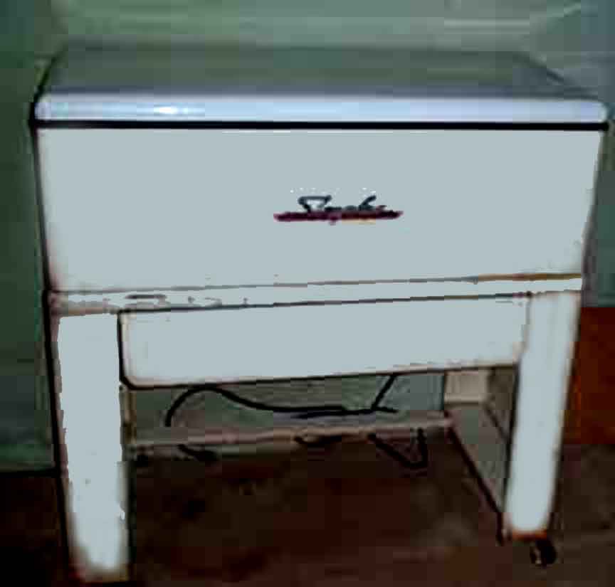 Speed Queen Ironer Click to Enlarge If you are seeking to restore a Speed Queen ironer )or just learn how to operate one), you would probably benefit from some of the material on the modern Simplex (above), since they were made by the same company. The GE Ironer General Electric made its entry into the home ironer business with a flat plate device. From a manufacturing point of view, this is a lot simpler and cheaper because it does not have the gears, pulleys and wires that run the roll mechanism. All you do is place the object on the hot plate and close the lid on top of it. This technique is limited to pieces that are small.