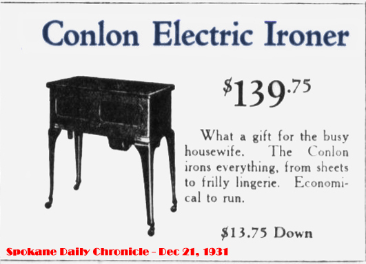 Conlon Ironer Patents (l to r) 1,652,561; 1,853,395; 1,867,839; and 2,365,542 Click to Enlarge The conlon Company seems to have advertised quite a bit as these ads show. Of note is the 1931 ad from Spokane that shows an ironer very similar to Patent No. 1,652,561. Other ads follow the general theme of "saves time" and "Easy to Use". The Ironer priced at $139.00 (in 1931) was very expensive, especially in the Depression. Adjusting for inflation, this sum is equivalent to about $3,200 in 2009 dollars.