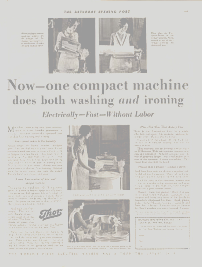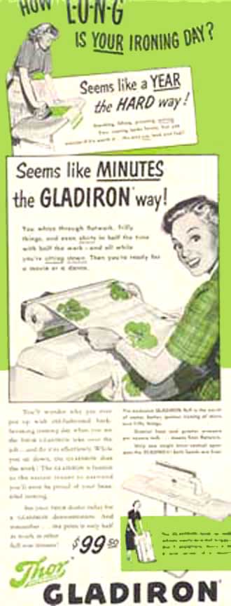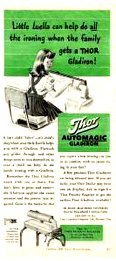 Thor Gladiron Ironer New Old Stock-- $134 then is equivalent to about $1,000 today Click to Enlarge Contemporary ads seem to mirror the general cultural theme of the 1940s that a woman could win increased affection from her spouse by performing household chores well.