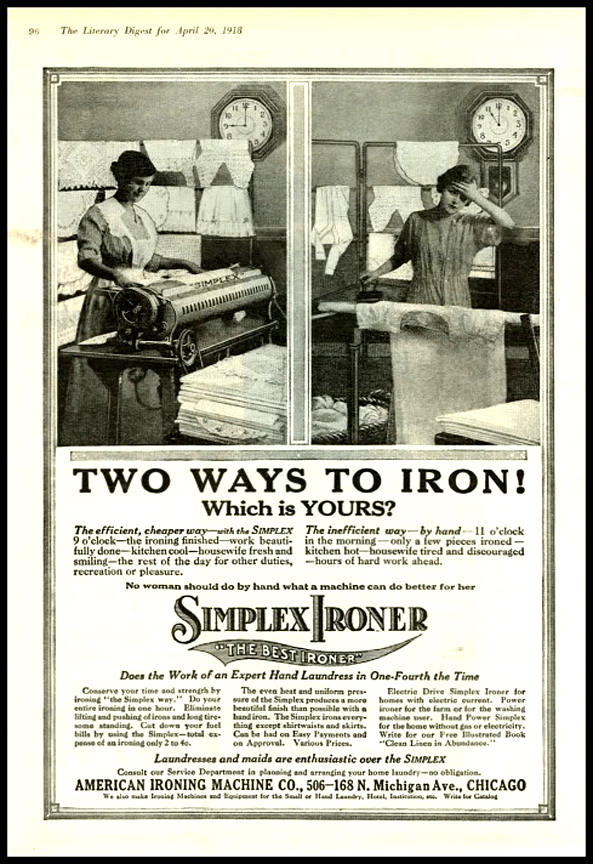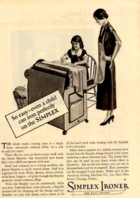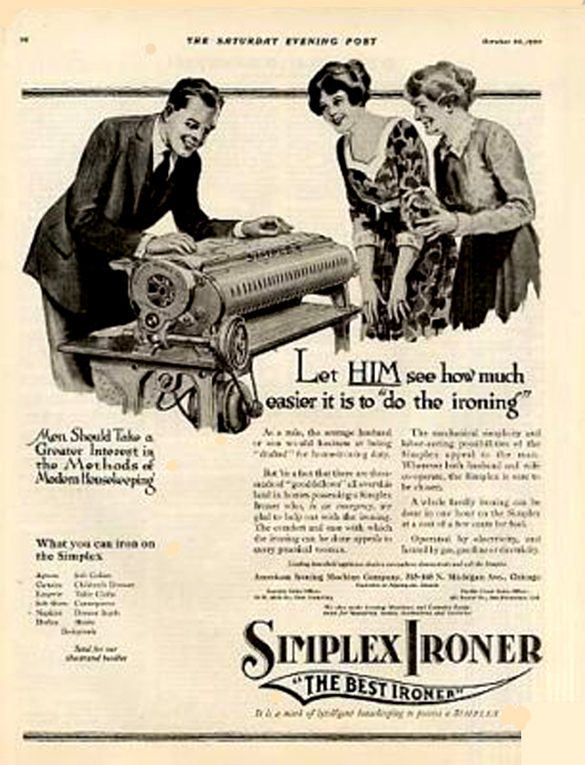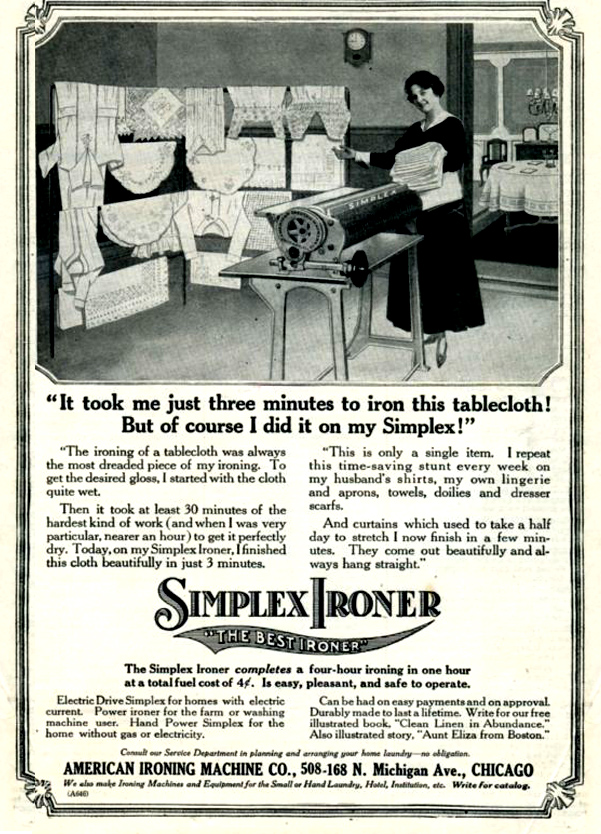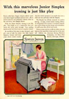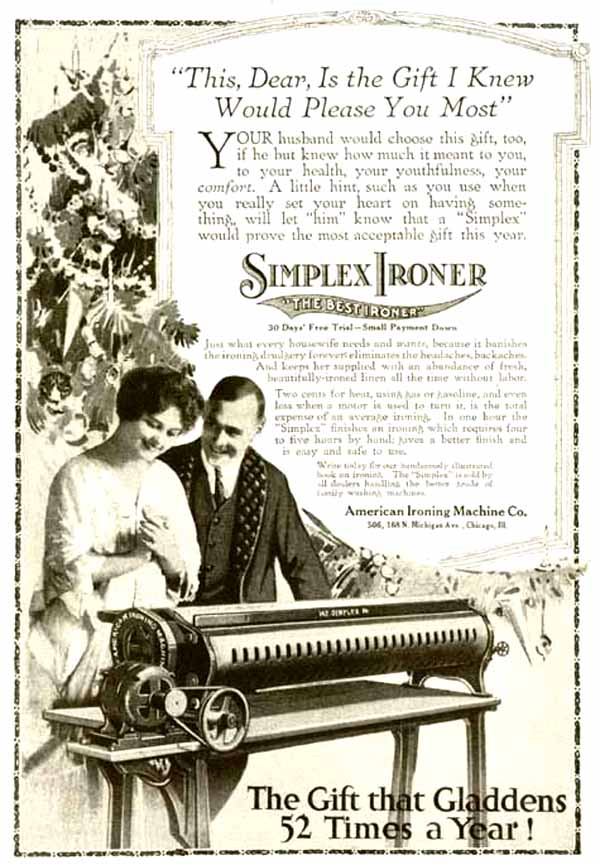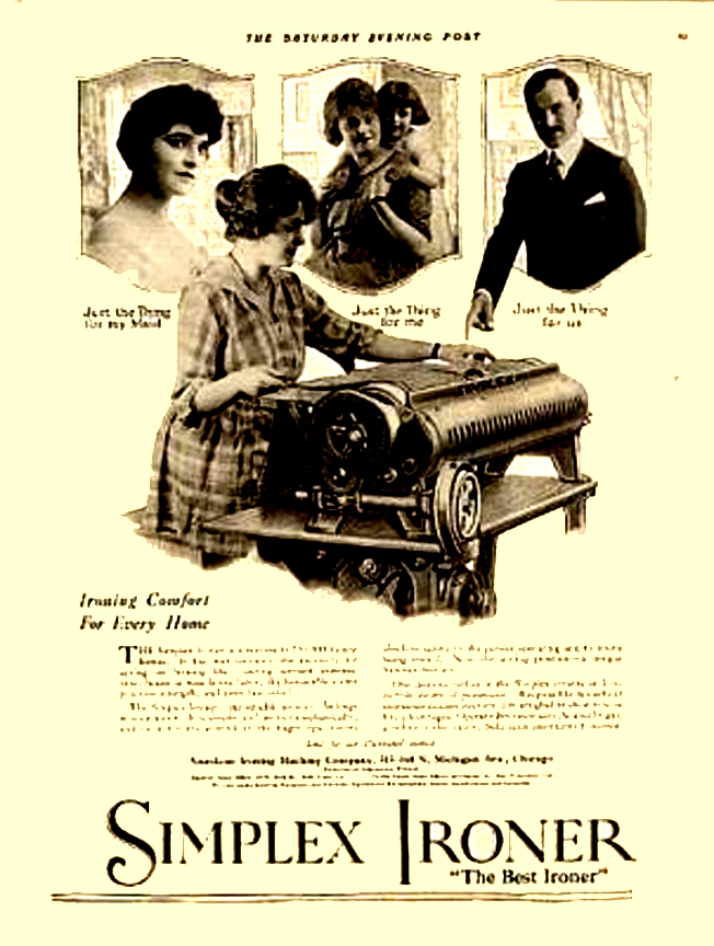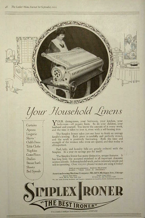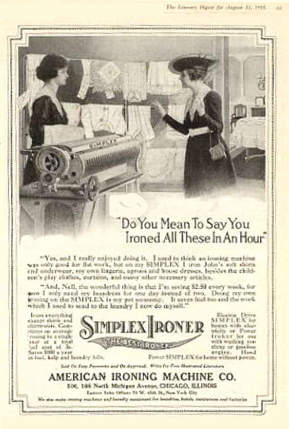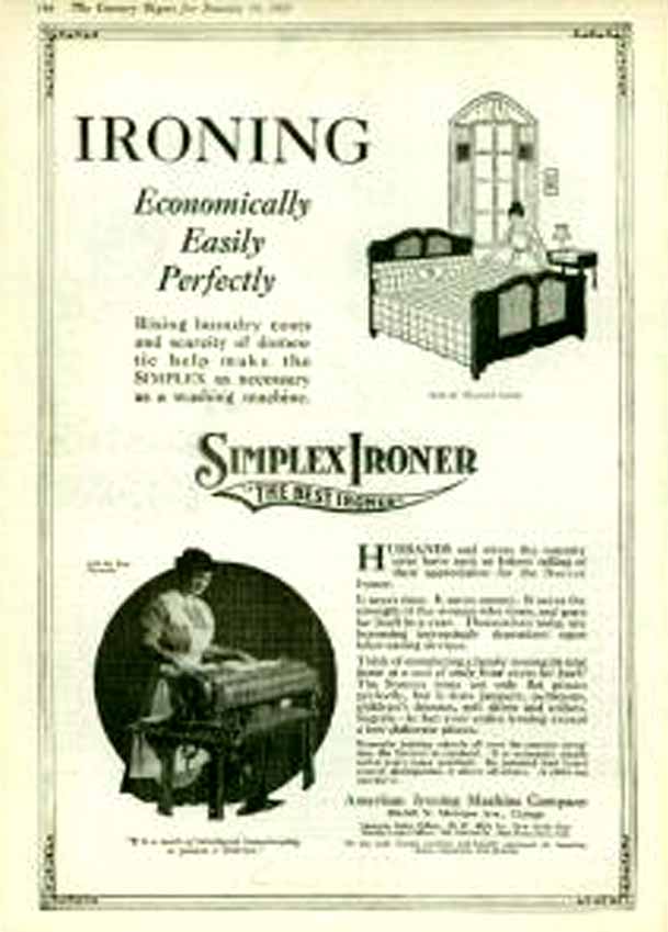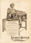 Thor Gladiron Ironer Design Patent D-143299 Gladiron Exterior Thor Gladiron Power transmission to the arm Patent RE2270 Thor Gladiron Inner Gear mechanisms Patent RE2270 Click to Enlarge Click here if you want to learn how to get Free Patent Drawings Thanks to Rita, one of our readers, we have a manual for the Gladiron. It is a ".pdf" that is about 6.6 MB; please contact us if you want a free copy of the Gladiron Manual. Patent RE22,720 has 24 pages -- and that can be a hassle to download. contact us if you want a 3.8MB zip file containing images of all 24 pages. There are 12 pages of drawings and 12 pages of explanatory text. As usual, we are always interested in stories, pictures and data which would help us understand this marque of Ironer The Simplex Ironer The Simplex Ironer has been around for a LONG time. Here is an ad from 1910: Targeted at the Man of the House, telling him what She wants Click to Enlarge Beginning in 1905, he Simplex Ironer was made by the Peter Brothers Manufacturing Company. The organization specialized in producing laundry ironers. The Company employed 200 people and produced 2,500 ironers per month. In 1920 Peter Brothers Manufacturing changed their name to American Ironing Machine Company.