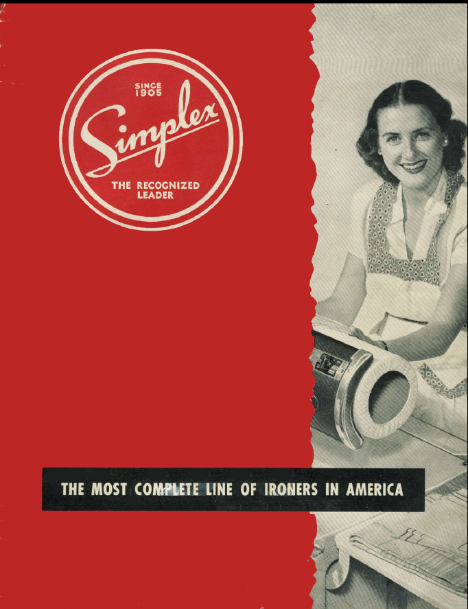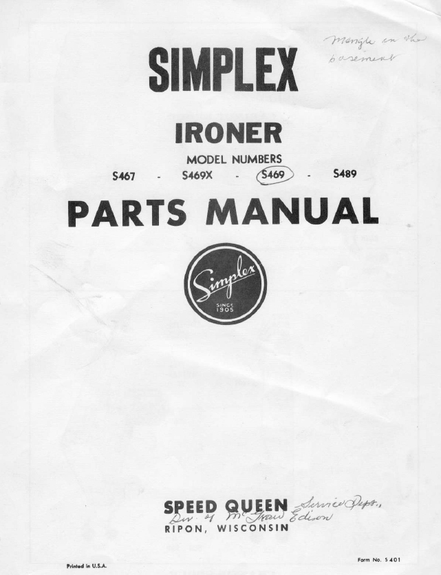 The Modern Simplex Manual, Parts List and Other Ephemera Click to Enlarge If you take a close look at the "Parts List" cover above, you'll note that Simplex had been taken over by McGraw-Edison, the manufacturers of the Speed Queen line of appliances. We siscuss this latter brand next. The Speed Queen Ironer These photos were sent to us by our friend Anna. She has a "Speed Queen" ironer that seems to have come to her new and unused! She writes: "...HELLO HERE OF SOME PICTURES OF MY SPEED QUEEN MANGLER THAT WORKS ABSOLUTELY PERFECT AND HAS NEVER BEEN USED!!!...IT HAS AN ORIGINAL GENERAL MOTORS PACKARD MOTOR THAT RUNS SILENT AND LIKE NEW AS WELL .....THIS MANGLE IS ALL ORIGINAL!!!.....I PURCHASED THIS ITEM FOR $1.00 AT THE LOCAL GOODWILL..."