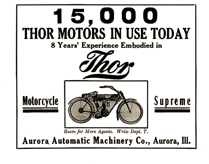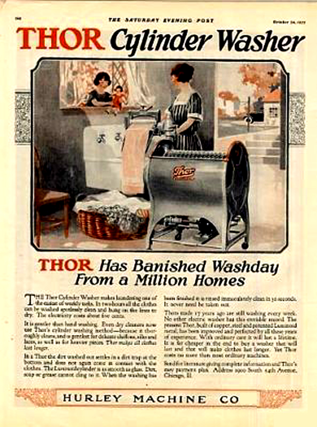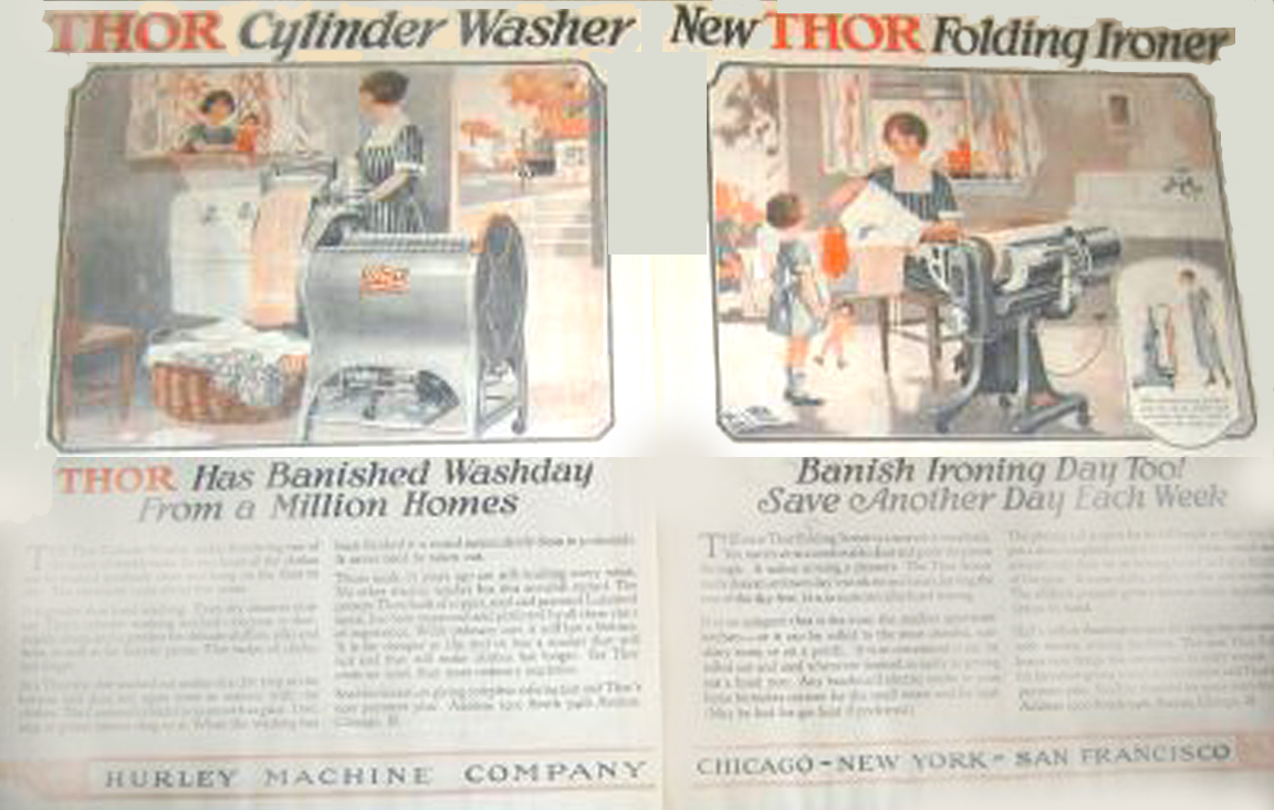 Thor Motorcycle Click to Enlarge In time, Thor acquired the Aurora Automatic Machinery Company, a manufacturer of parts for bicycles and motorcycles, including the Sears and Indian motorcycles. Eventuallly, Thor sold its own brand of motorcycle from the early 1900's until 1918. Notably, Thor introduced the first sidecar. For a brief time, the company also manufactured a Thor automobile. None of this, however, has anything to do with washers and ironers. In a parallel universe, Hurley's two younger brothers, Neil and Edward formed an independent company that manufactured washing machines. Through the intercesssion of their older brother, they received permission to use the Thor logo and name on its new venture. However, there was never any corporate or financial relationship between the washing machine company and the power tool company. Shortly after introducing the electric washing machine, the Hurley brothers introduced the Thor rotary iron, usually known as the "Gladiron" Note that this is a clever play on Mrs. Potts' "Sadiron", on our Ironing History Page that required stove top heating by the user.