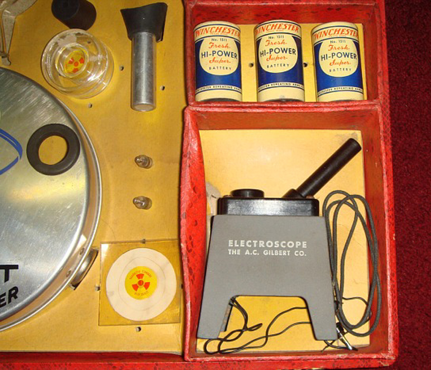 The "Gilbert U-238 Atomic Energy Lab" was introduced by A.C. Gilbert in the spring of 1950 and sold for $42.50, a sum that would be equivalent to about $500 in 2010. Our reader Bill from Ohio was kind enough to send in some photos of his unusually complete Atomic Energy set