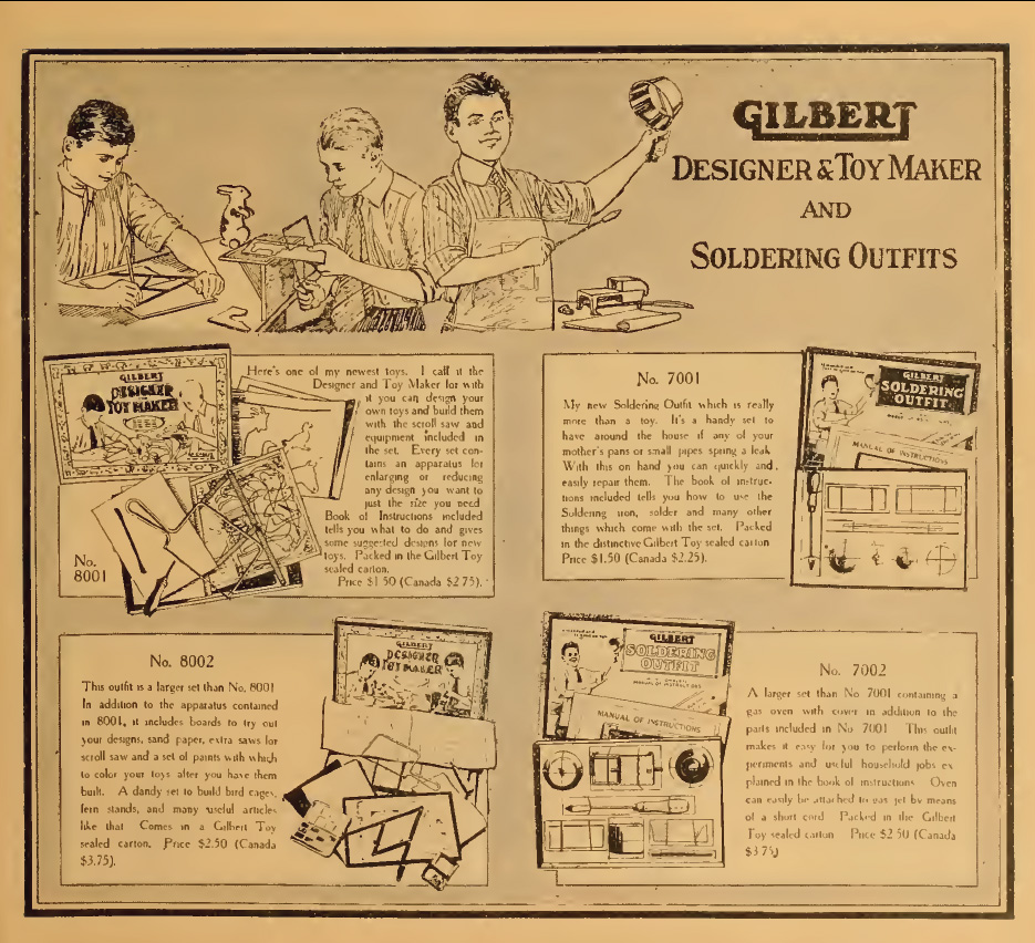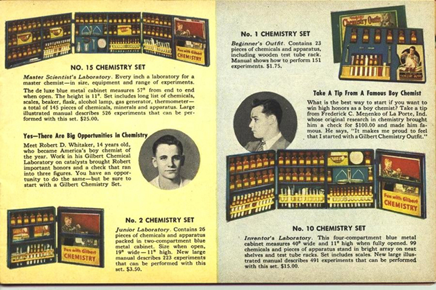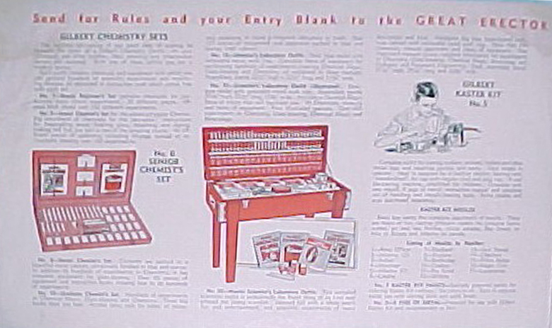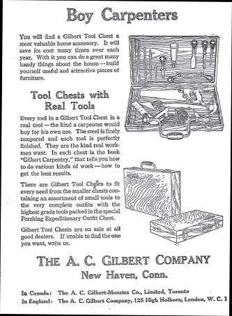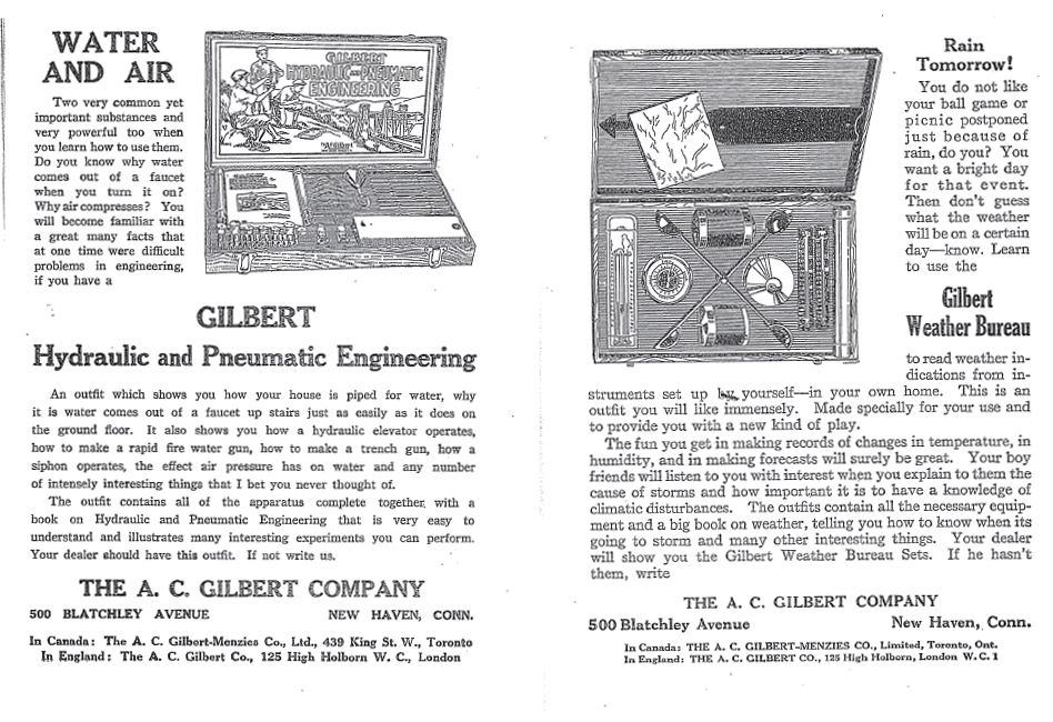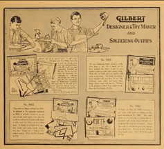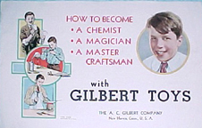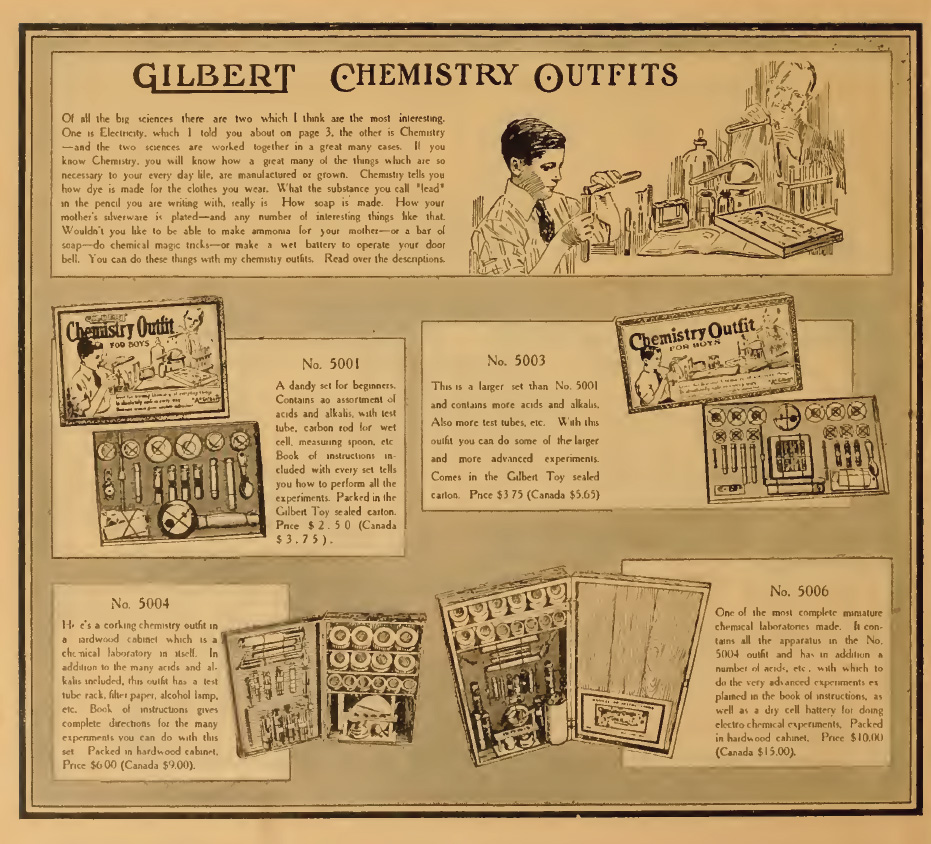 GILBERT CHEMISTRY OUTFITS-A real wonder set with chemistry manual and laboratory apparatus. With it you can make disappearing ink, fire without matches, pour milk from a bottle full of water, make soap and many other things. Prices $2.50 to $5.00. In Canada $3.75 to $7.50.