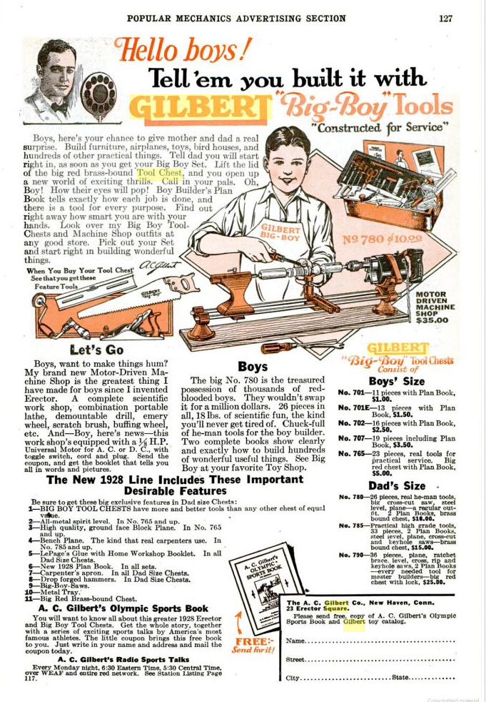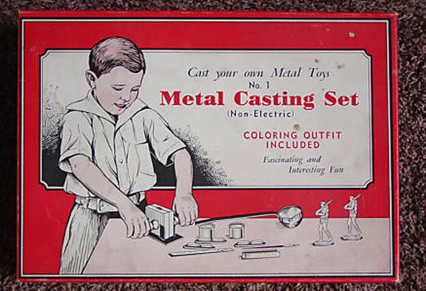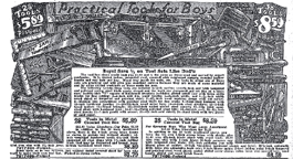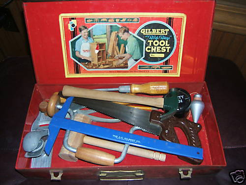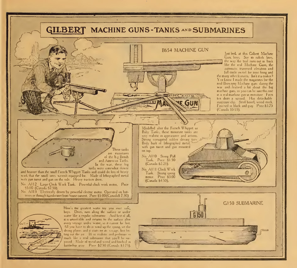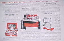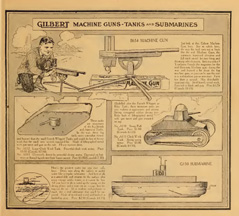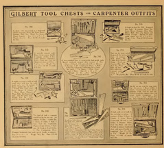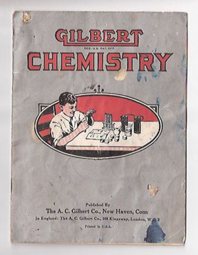GILBERT CHEMISTRY OUTFITS-A real wonder set with chemistry manual and laboratory apparatus. With it you can make disappearing ink, fire without matches, pour milk from a bottle full of water, make soap and many other things. Prices $2.50 to $5.00. In Canada $3.75 to $7.50.