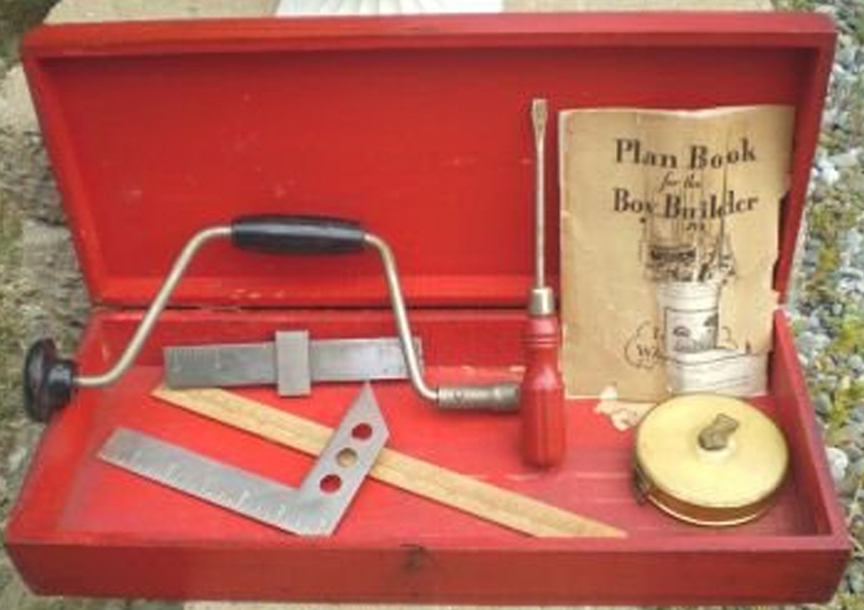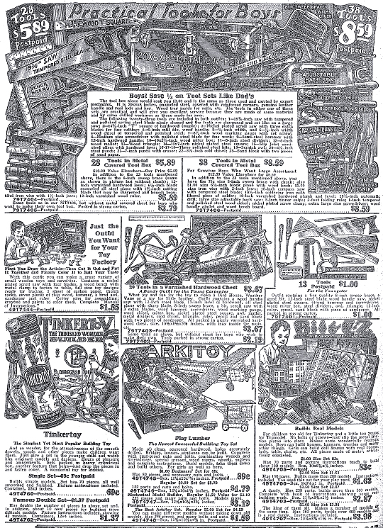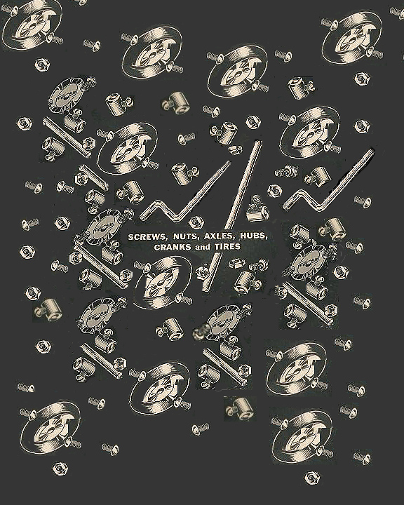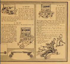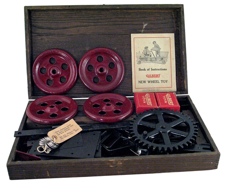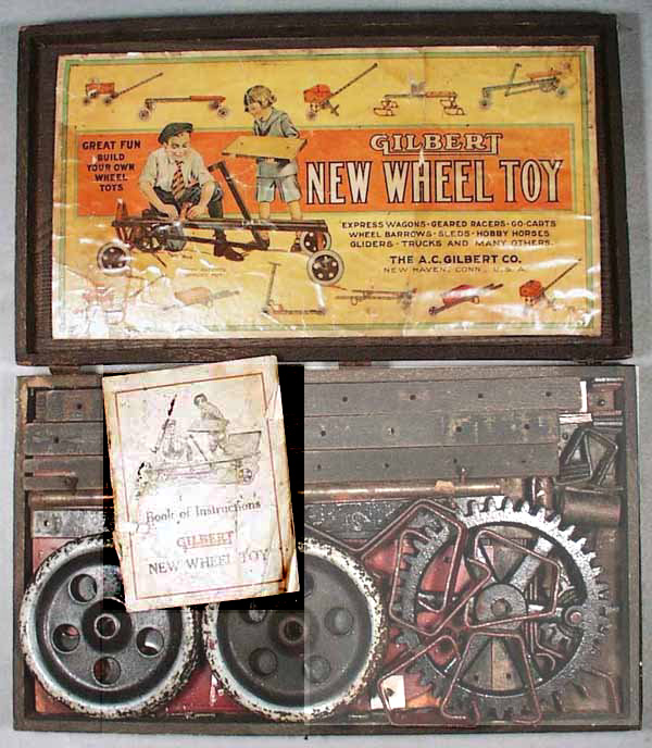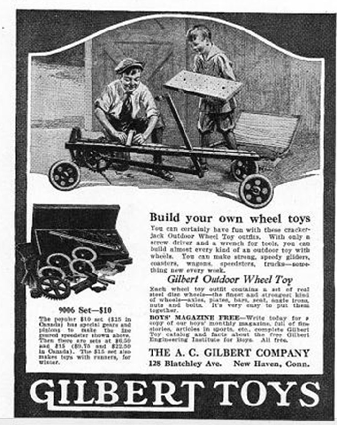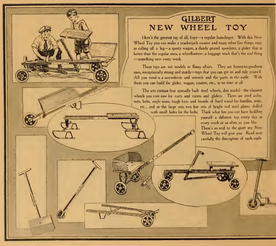 Mr. Gilbert looked around and saw that Boys would cobble together almost any old parts to make a scooter, coaster, wagon or other "vehicle". Most likely, the wheels came off a discarded item like a perambulator. In many cases, the wheels didn't even match in size. Gilbert invented an "all purpose wheel" that bore a strange resemblance to baby buggy wheels. He then packaged these along with axles, cotter pins, brackets and the like that would enable the Boy to make any number of fanciful vehicles.