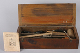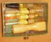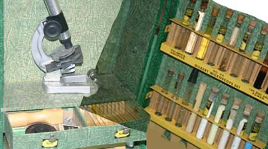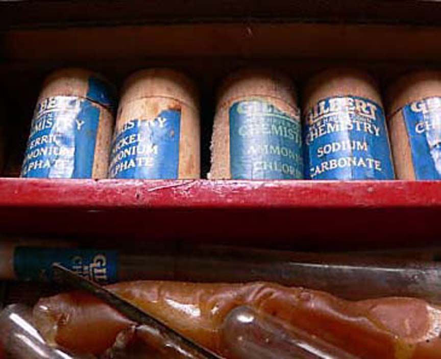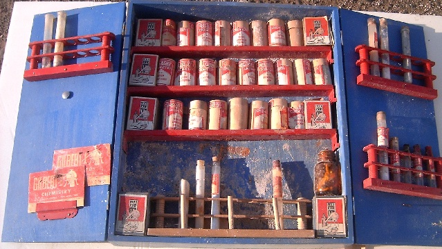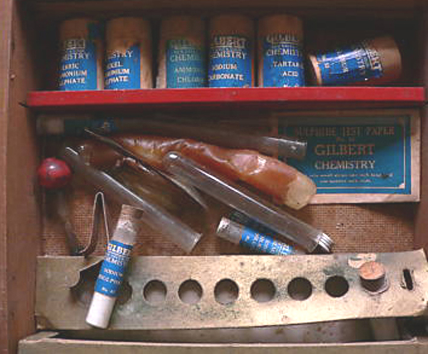 Given this history, it was with some pleasure that I managed to find an old (c.1920) Gilbert Chemistry set in a wooden box. The box was in good shape and some of the chemicals were still present. However, someone had been using a candle and several test tubes and instruments were encased in wax.