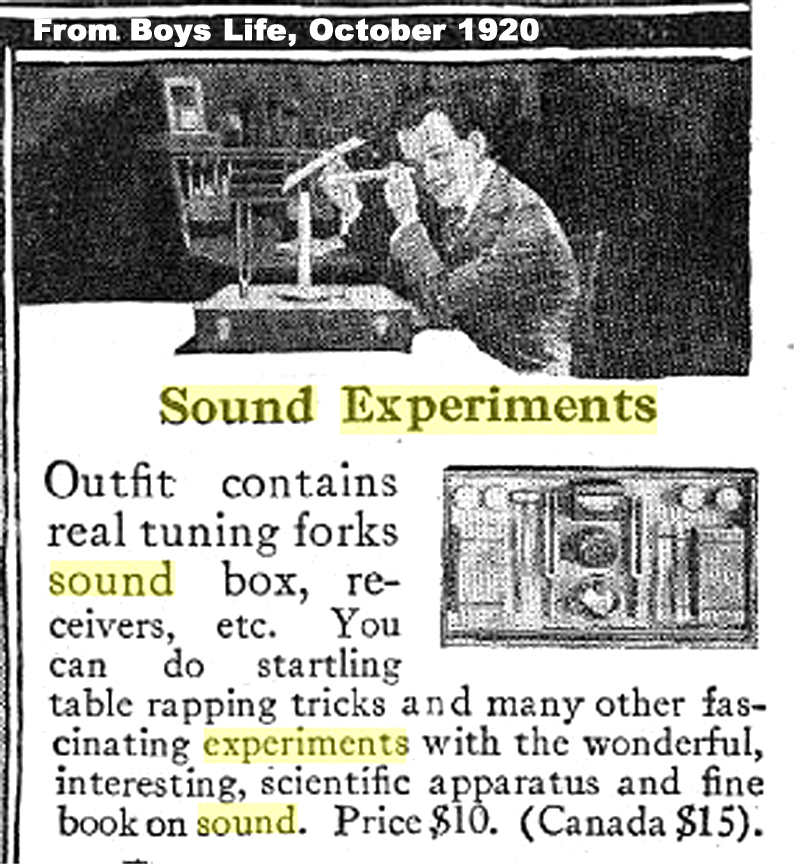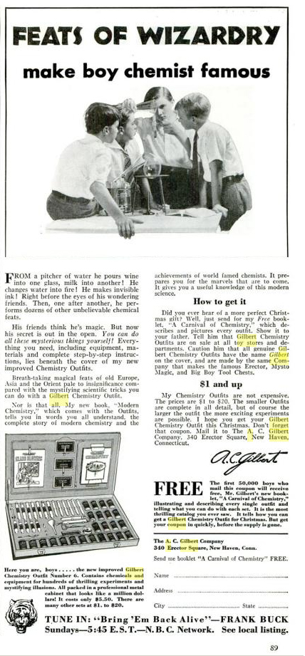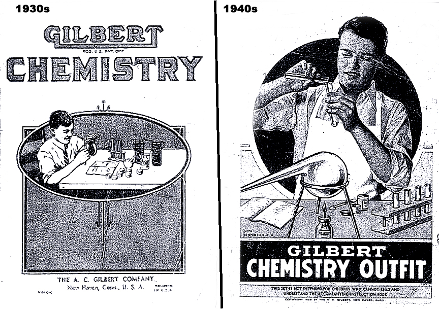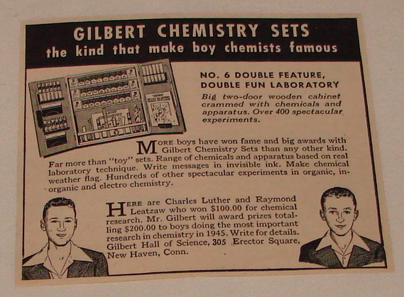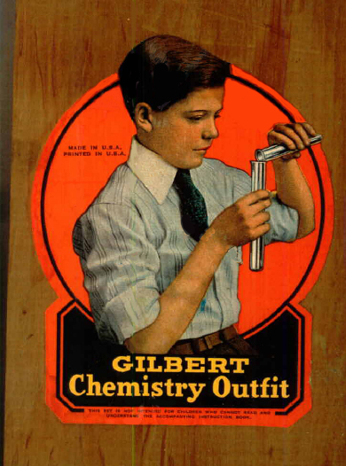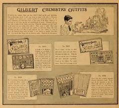 Gilbert's successful approach to Boys used a mixture of entertainment and knowledge. If you place "Gilbert Chemistry set" into a search engine, you will find a large number of citations from scientists who got their start with one of these outfits. On the left is an ad for some of the more elaborate sets that feature testimonials from promising young scientists; on the right is an ad that shows how the Boys were drawn into a serious study of Chemistry.