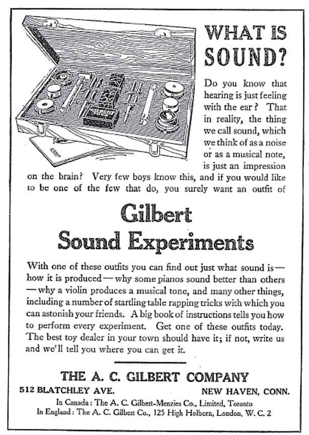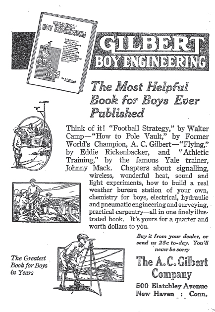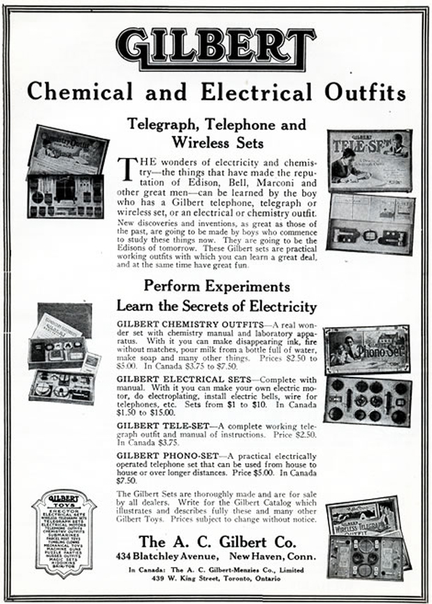 The wonders of electricity and chemistry – the things that have made the reputation of Edison, Bell, Marconi and other great men – can be learned by the boy who has a Gilbert telephone, telegraph or wireless set, or an electrical or chemistry outfit. New discoveries and inventions, as great as those of the past, are going to be made by boys who commence to study these things now. They are going to be the Edisons of tomorrow. These Gilbert sets are practical working outfits with which you can learn a great deal, and at the same time have great fun.