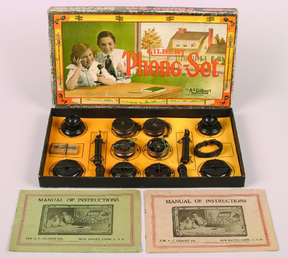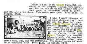 GILBERT PHONO-SET-A practical electrically operated telephone set that can be used from house to house or over longer distances. Price $5.00. In Canada $7.50.