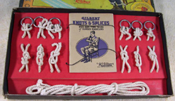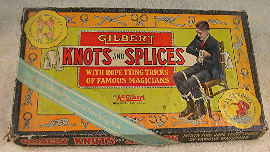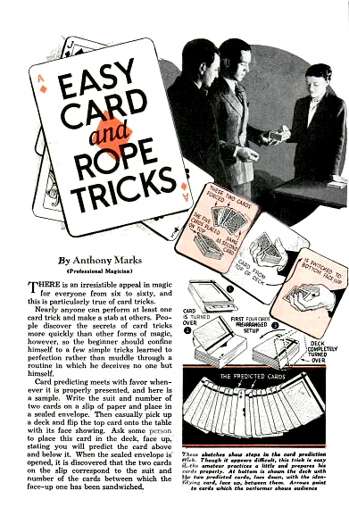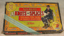Mr. Gilbert also sold some more specialized magic kits, such as the "Knots and Splices" set shown above. These kits are fairly rare. However,we have been very fortunate to obtain a copy of the manuals for these sets, including not only Knots and Splices but also Handkerchief Tricks and Coin Tricks. We do not have a copy of the instruction manual for the very rare Card Tricks set. If you have such a manual, please consider scanning it and sending it to us, so that we may make it available to the public. For the time being, we are including an article on "Simple Card Tricks" that appeared in the May, 1937 issue of Popular Mechanics.
