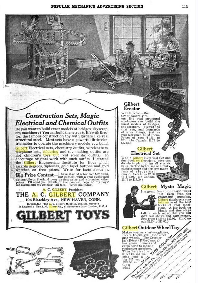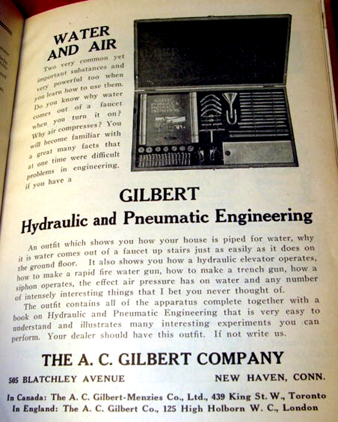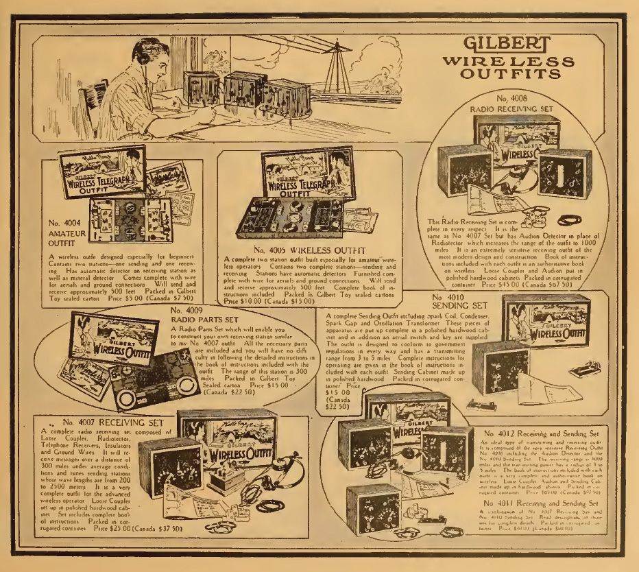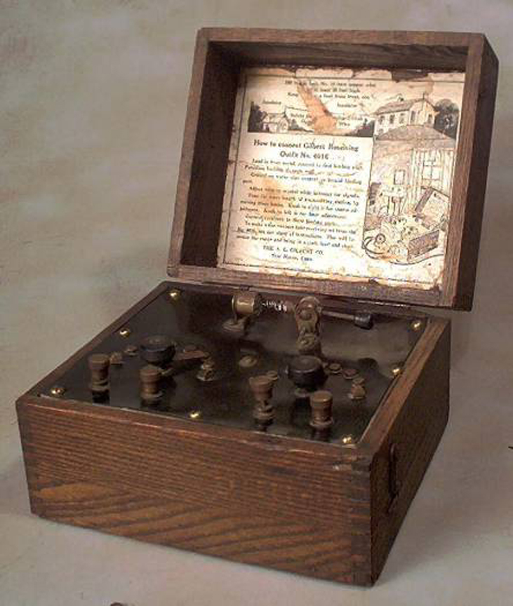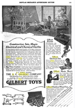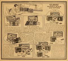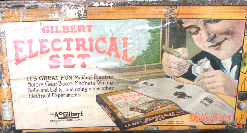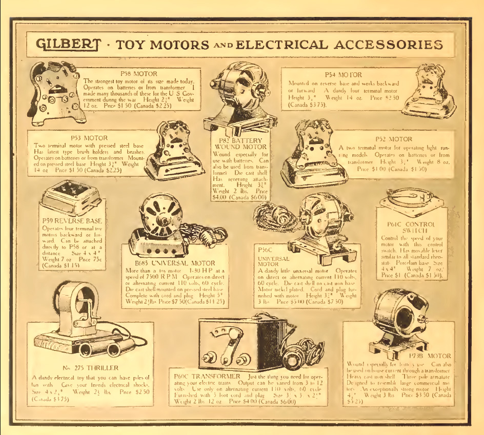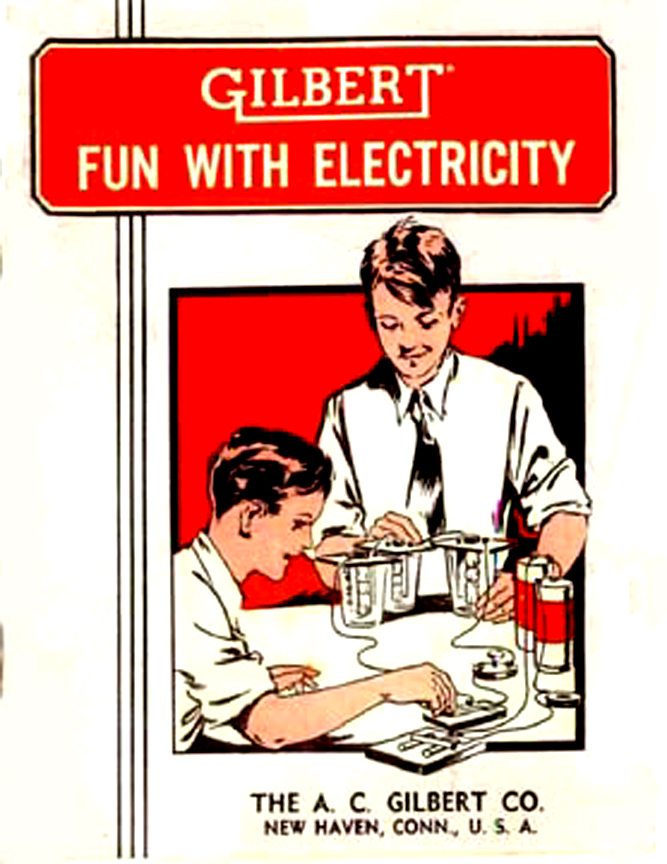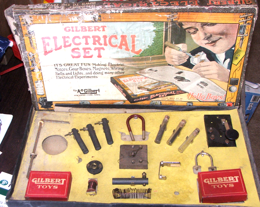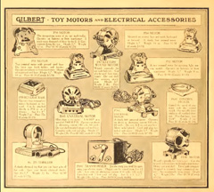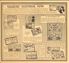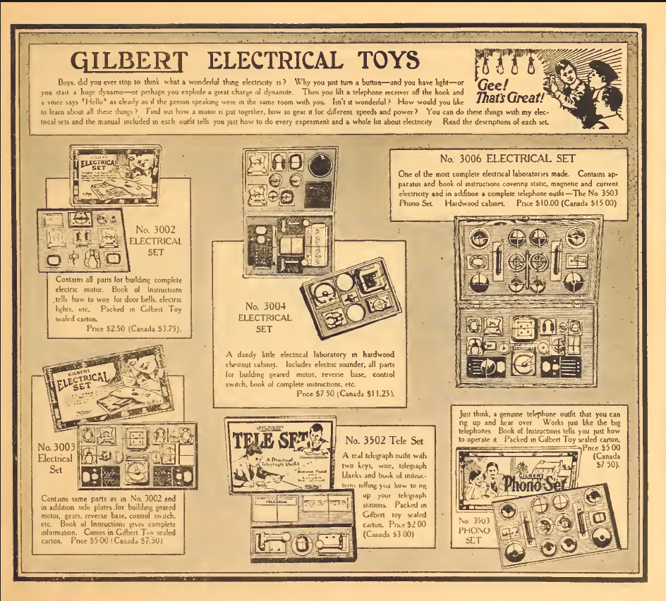 GILBERT ELECTRICAL SETS-Complete with manual. With it you can make your own electric motor, do electroplating, install electric bells, wire for telephones, etc. Sets from $1 to $10. In Canada $1.50 to $15.00.