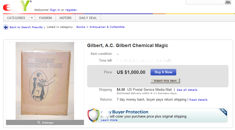 A recent (2010) online auction wanted $1,000 for this book, showing that there is no limits to the degree to which dealers believe in the gullibility of buyers. We have been able to obtain and scan a copy of Chemical Magic which you may download right now ABSOLUTELY FREE. It is a 62 page booklet which we have separated into four parts to minimize bandwidth usage. Please SAVE the file to your computer and then read it:
