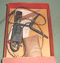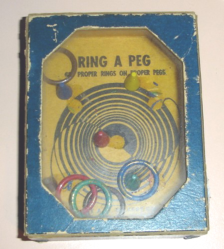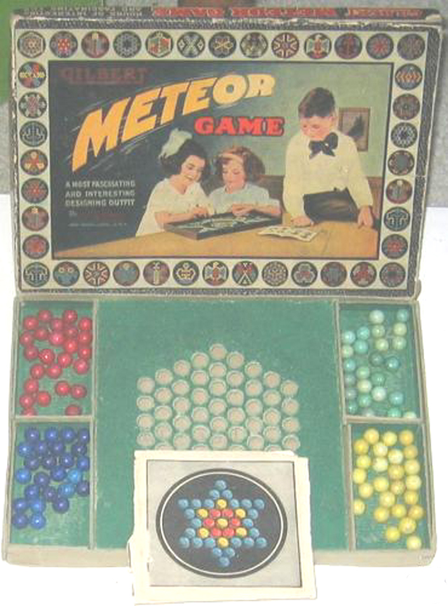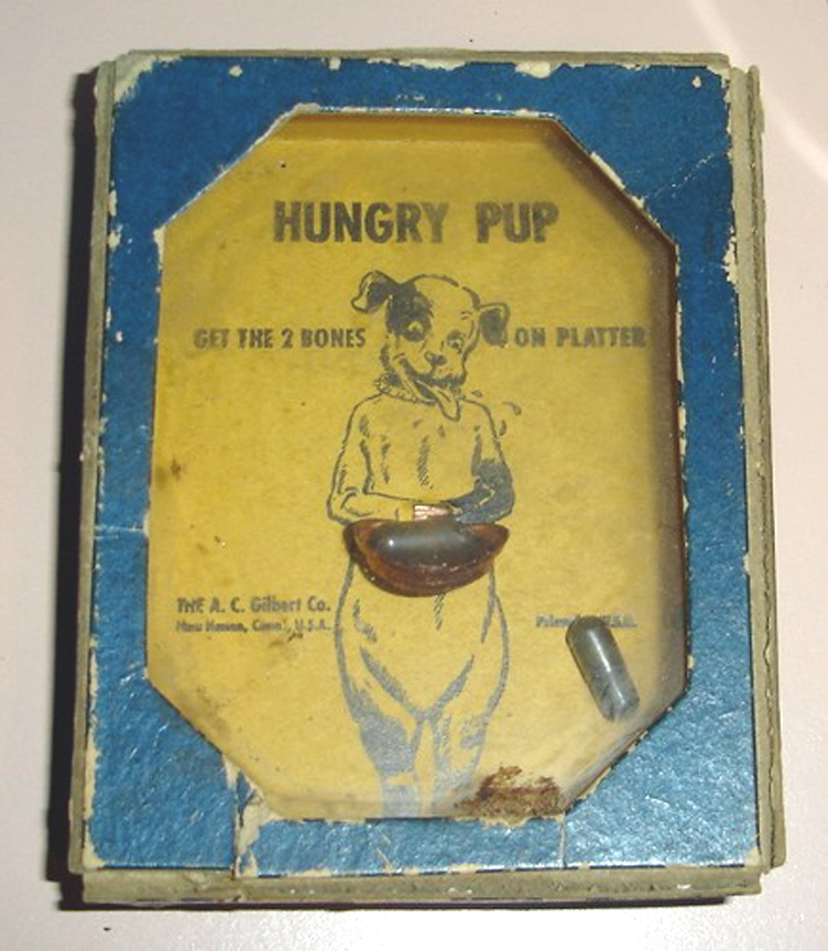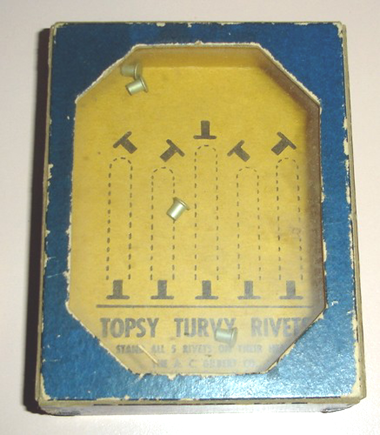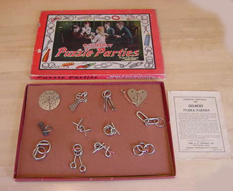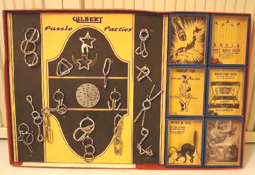 In addition to twisted wires, the Gilbert company also offered "Hand Puzzles" -- this was a glass-topped cardboard box with some loose items inside. The object was to carefully maneuver the box to cause the objects into slots or holes or onto pegs. This typoe of hand puzzle is quite similar to the "Game Boy" portable video game of today.