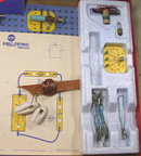 The animation subjects are fairly mundane: a Cowboy twirling a lasso, a big fish eating a little fish, a man getting bitten by a mosquito... On the other hand, the set illustrates the basic nature of animation, including "Critical Flicker Frequency" (about 19 frames/sec) by which the eye perceives motion and not separate images. The kid could amuse himself by running the probe around the contact at different speeds, running it backward, etc. With blank cellophane and India ink, the Boy could make his own animations. [Right now, I am thinking that the definition of "microsecond" is the time after opening the box that it took for the Boy to hit on the idea of making a pornographic animation....]