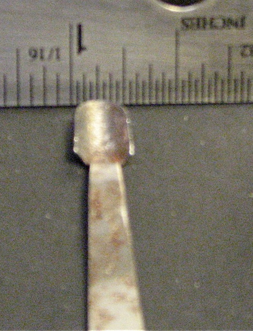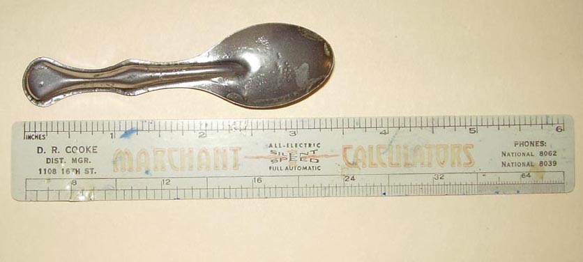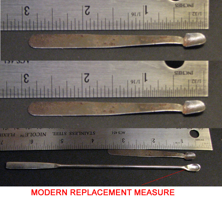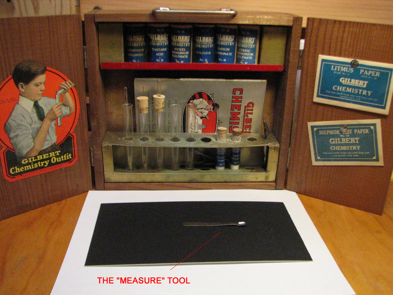 "... I photographed the measure from my old 1920's Gilbert set. I actually have sets from several decades, but the measure didn't change much in size from set to set. As you can see, it's a little spoon approx. 1/4" wide x 5/16" long with a total length of about 2 7/8". The amount of material it holds is about the size of a lentil or a small pea. I'm glad to see that Robert bought fresh chemicals from HMS Beagle since the old chemicals are usually DOA. It's so great that they have put together the chemicals from the old Gilbert sets so folks can do the experiments. It's how I started with my son at about the same age.