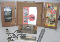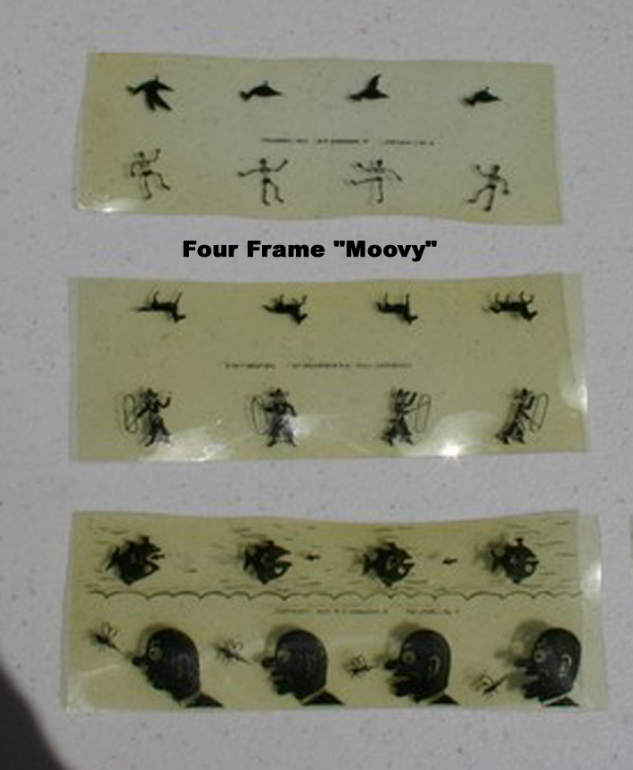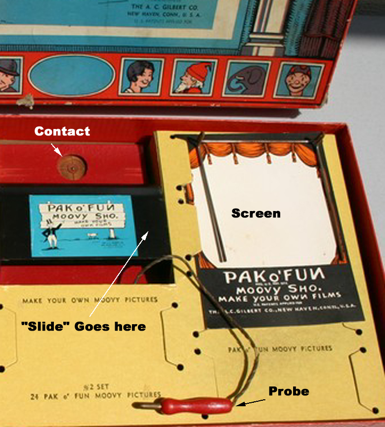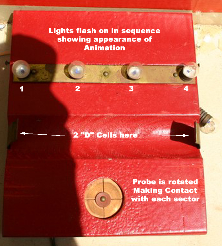 The set has all the fundamentals of animation -- the only problem is that the "films" are only four frames long. YES, it is a "moovy" albeit a very short one. The system uses cellophane "slides" that have four slightly different image. Each image is illuminated by its own 1 Watt bulb. The cellophane strip is placed in a curved chamber so that each image is projected on to the same spot on a cloth screen. The bulbs are lit by using a probe to touch each of four contact points laid out as sectors of a circle.