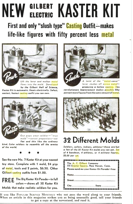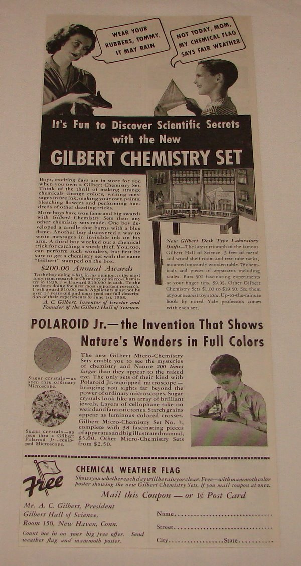 Chemistry was a very big deal during the "Golden Age" of Gilbert Science Kits. In 1937-1938, Popular Mechanics ran an amazing four part spread on "Chemistry and You" that touched on all the marvelous ways that chemistry was making a better future for everyone. You might want to take a look at these articles to get an idea about what expectations that Parents and Boys had for Chemistry.