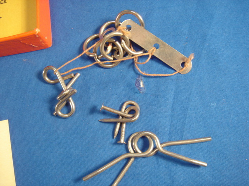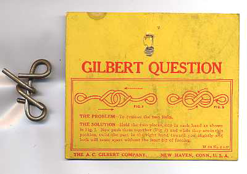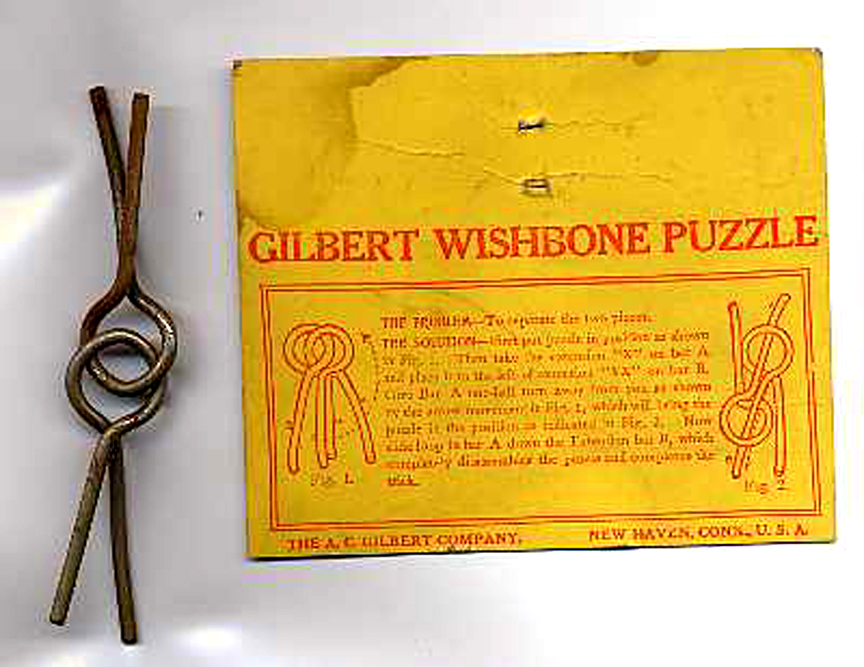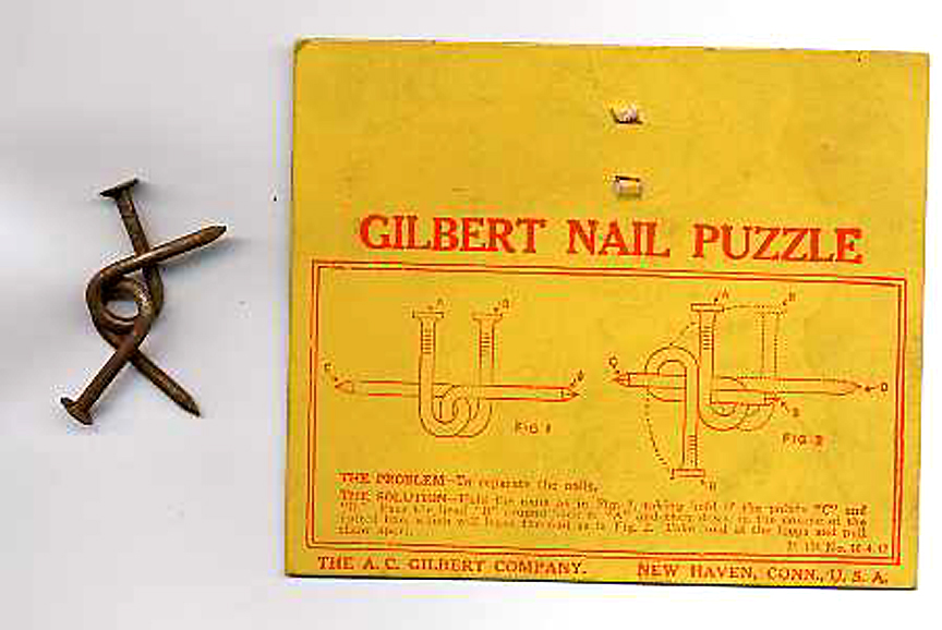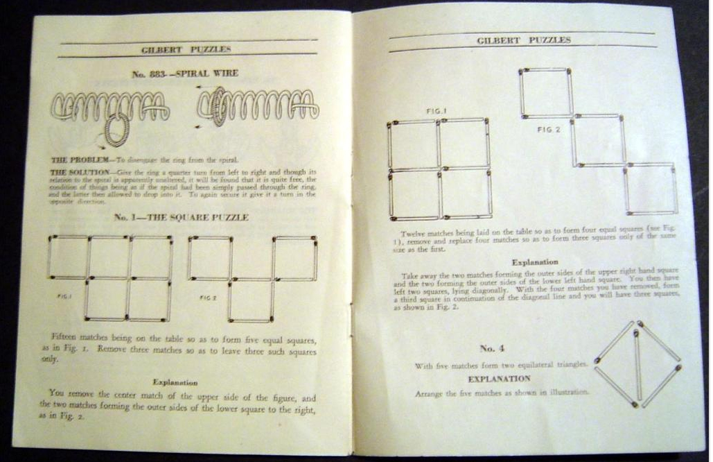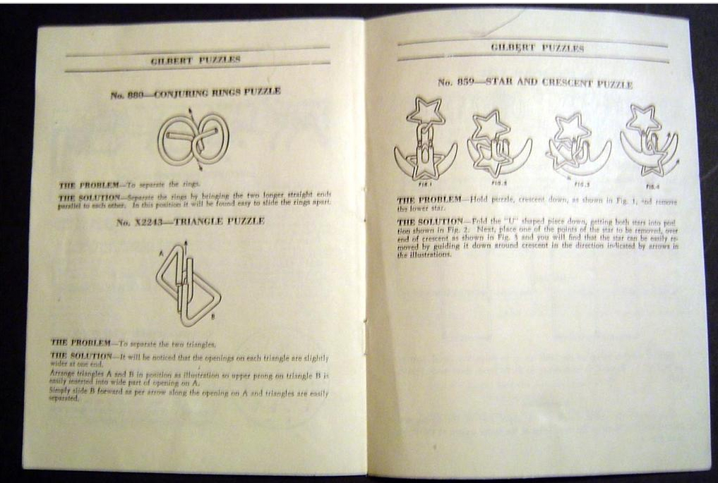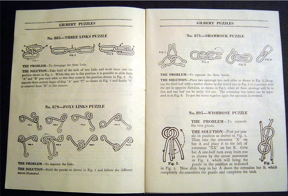 The puzzles involved separating wires or nails that appeared to be inextricably twisted together. Fortunately, Mr. Gilbert also provided "The Trick" to solving the puzzle. This is sort of "SAT Coaching" 1910 style.