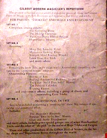 Gilbert even included in his basic kit a checklist of the tricks that might be prformed at "Parties, Smokers and Stage Entertainment", indicating that the Boy could be ready for the Big Time in no time if he bought and mastered the kit.