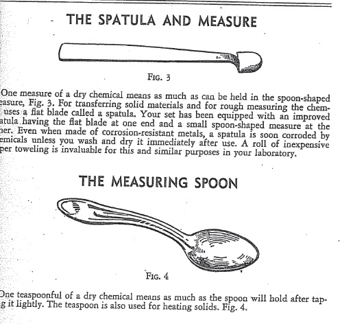 "... I had a chemistry set when I was kid, and now my daughter (age 7) is interested in Chemistry. I've bought all the chemicals from H M S Beagle and I'm pretty well set up, but one question remains: What is a "measure"? I remember a small shovel shaped piece of metal that was used to define a measure, but I don't have one now and I don't know how big it should be. My daughter and I have tried some of the experiments in the old Gilbert manual, but they didn't work, I think because the measurements are wrong. Do you have any idea?