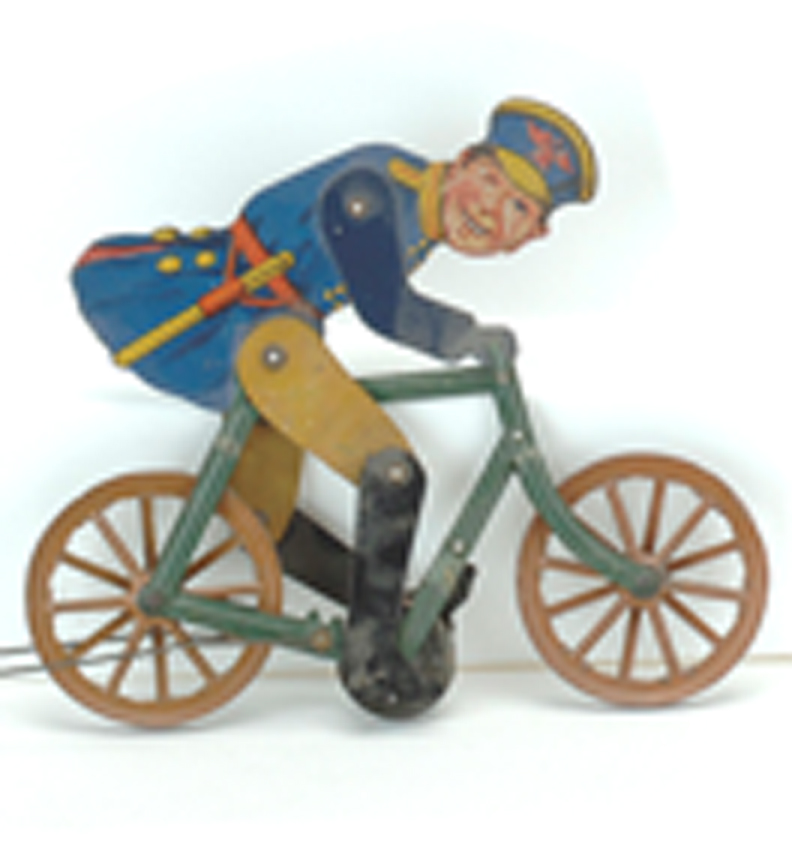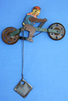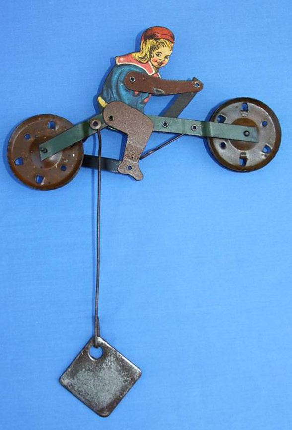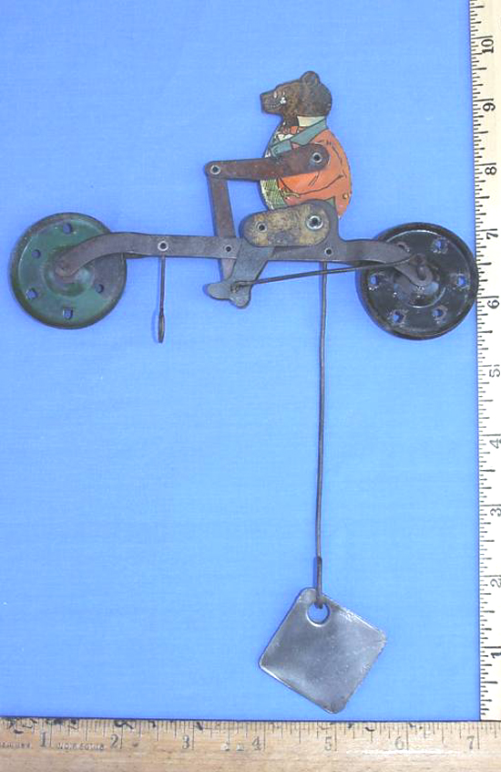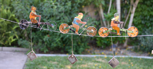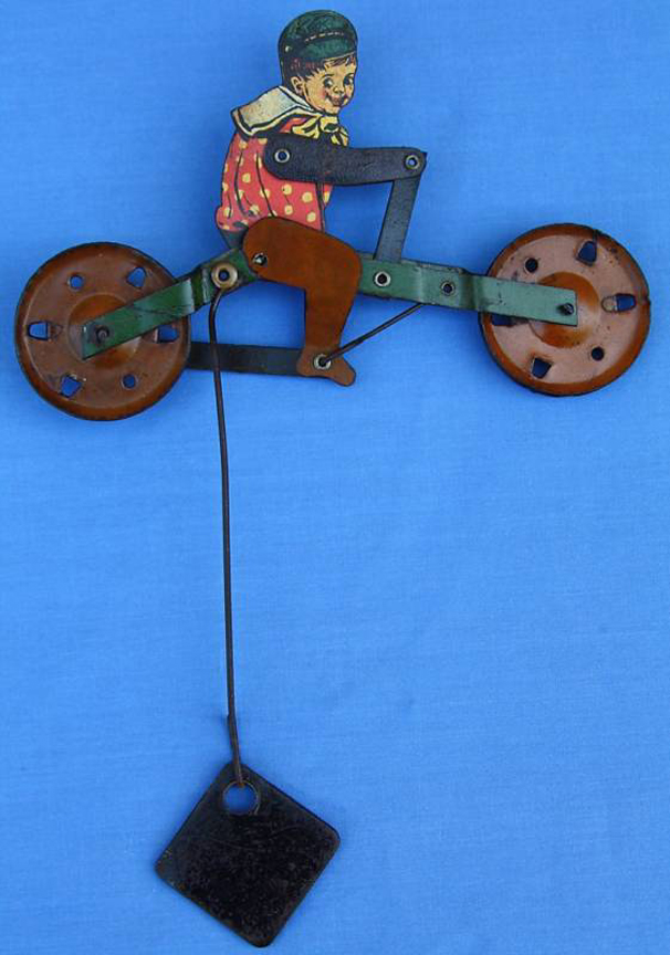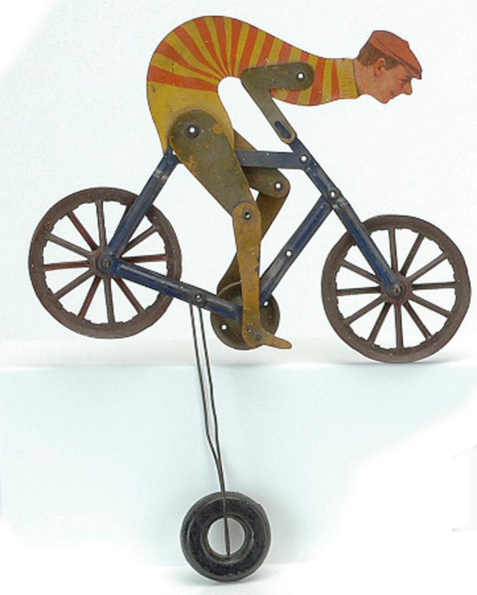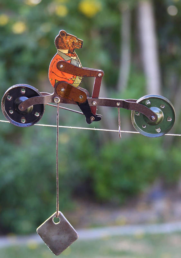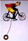The String Riders do just that -- they ride down a stretched piece of twine -- the arrangement causes the feet to appear to be pedaling. Although their colors are very charming, I fail to see how a toy like this managed to hold the attention of a child for very long...
