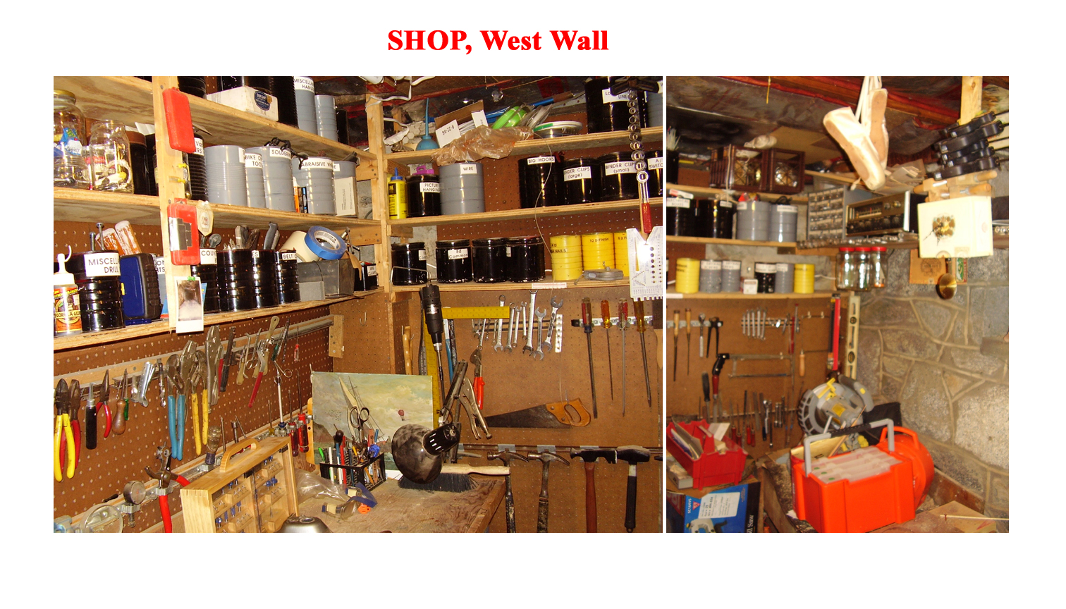 This is the Workshop where we restore all this junk. The room has four stone walls and was originally a walk-in refrigerator. We'll start at the West Wall (top of the diagram above) and work around the room counterclockwise (South, East...) The West Wall Click to Enlarge The room is fairly small, so we have had to make use of every square inch with a wide variety of shelves and containers.