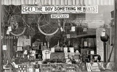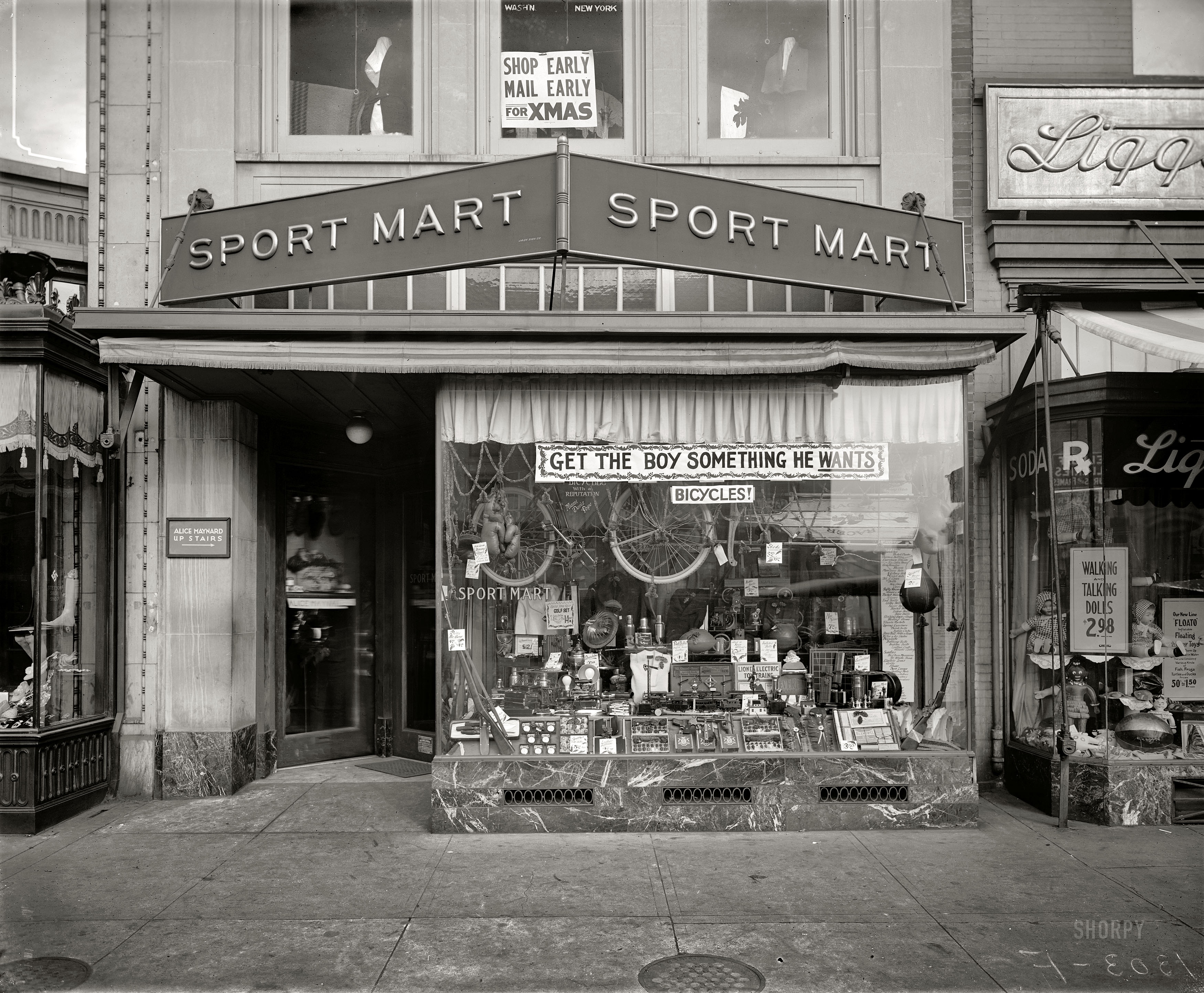 The Sport Mart They even had a chess set... Click to Enlarge We love the slogan "Get the Boy Something He Wants". We have enlarged the photo to give you an idea of the variety of merchandise on display, that ran the gamut from a punching bag to a chess set. | |||||||