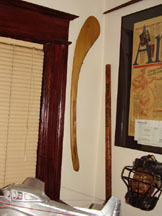 The caman or hurley (left)Closeup of the Caman (middle)The Caman in use (right)The Caman on the South wall of my office (click to enlarge) Hurling (in Gaelic, iománaíocht or iomáint) is an outdoor team sport of ancient Gaelic origin. The game, played primarily in Ireland, has prehistoric origins and is the world's fastest field team sport in terms of game play. One of Ireland's native Gaelic games, it shares a number of features with Gaelic football, such as the field and goals, number of players, and much terminology. There is a similar game for women called camogie (camógaíocht). The object of the game is for players to use a stick called a hurley or hurl (in Gaelic a camán, pronounced ["kuh-mon"]) to hit a small ball called a sliotar (pronounced "slah-tur") between the opponents' goalposts either over the crossbar for one point, or under the crossbar into a net guarded by a goalkeeper for one goal, which is equivalent to three points. The sliotar can be caught in the hand and carried for not more than three steps, struck in the air, or struck on the ground with the hurley. It can be kicked or slapped with an open hand (the hand pass) for short-range passing. A player who wants to carry the ball for more than three steps has to bounce or balance the sliotar on the end of the stick (this is often called "going solo"), and the ball can only be handled twice while in his possession. Side to side shouldering is allowed although body-checking or shoulder-charging is illegal. No protective padding is worn by players, and although a plastic protective helmet with faceguard is recommended, this is not mandatory for players over 19. Here is a Video that explains more about the sport of Hurling. Hurling is represented in some form on all continents apart from Antarctica and is popular among members of the Irish diaspora in the United Kingdom, North America, Europe, Australia, New Zealand, South Africa and Argentina. Policemen often refer to their night-stick as a "Come-On" -- prior to experiencing the world of Hurling, I always thought that this term meant "something to assist the officer in escorting his prisoner to the jail." Since the Irish have contributed disproportionately to the ranks of police officers, I suspect that "Come-On" is actually derived from the camán Those of you who would like to know more about this fascinating sport should consult the website of the Gaelic Athletic Association. CricketMy travels also took me to a number of countries, all parts of the Former British Empire, and I guess now part of the Commonwealth of Nations. Along with tea in the afternoon and the stiff upper lip, the British left Cricket as a legacy in all these disparate countries. This sport is much more refined than Hurling and often includes time for tea breaks. It is one of the few games that has an indeterminate length. The Brits, inventors of cholera blankets and the opium trade, have infused the game with lots of jolly Good Sportsmanship. For the record, cricket is a bat-and-ball team sport that originated in southern England. The earliest definite reference is dated 1598, and it is now played in more than 100 countries. Given the fact that it has been played for more than 400 years, a large accretion of customs and rules have become attached to the game -- as well as arcane and obfuscating terminology. There are several forms of cricket; at its highest level is Test cricket, in which the current leading national team is Australia. Test cricket is followed in rank by One Day International cricket, whose last World Cup was also won by Australia; the tournament was televised in over 200 countries to a viewing audience estimated at more than two billion viewers. It is only fitting that former Colonies like Australia (once a dumping ground for convicts), India, and Jamaica should have world preeminence in the sport. A cricket match is contested by two teams, usually of eleven players each, and is played on a grass field in the centre of which is a flat strip of ground 22 yards long called a pitch. A wicket, usually made of wood, is placed at each end of the pitch and used as a target. The bowler, a player from the fielding team, bowls a hard leather, fist-sized, 5.5 ounces cricket ball from the vicinity of one wicket towards the other, which is guarded by the batsman, a player from the opposing team. The ball usually bounces once before reaching the batsman. In defence of his wicket, the batsman plays the ball with a wooden cricket bat. Meanwhile, the other members of the bowler's team stand in various positions around the field as fielders, players who retrieve the ball in an effort to stop the batsman scoring runs, and if possible to get him or her out. The batsman—if he or she does not get out—may run between the wickets, exchanging ends with a second batsman (the "non-striker"), who has been stationed at the other end of the pitch. Each completed exchange of ends scores one run. Runs are also scored if the batsman hits the ball to the boundary of the playing area. The number of runs scored and the number of players out are the main factors that determine the eventual match result.To delve further into the mysteries of Cricket, check out the website of the International Cricket Council, headquartered in Dubai. My own personal experience with cricket comes from an afternoon of awkwardly embarassing play pitting a group of aging Yanks against an equally superannuated group of Oxonians at an Energy Modeling Forum meeting in Oxford. I brought home the cricket bat shown below as a souvenir.