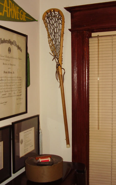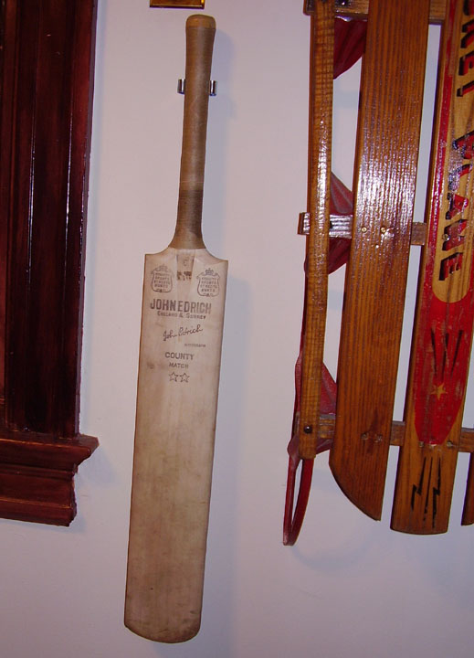 The John Edrich Cricket Bat (click to enlarge) John Hugh Edrich MBE (born 21 June 1937 in Blofield, Norfolk) is a former English cricketer who played for Surrey and England. He earned a reputation as a dogged and fearless batsman, and his figures show that he was amongst the best players of his generation. He played a total of 77 Test matches for England in an international career lasting from 1963 to 1976. He once completed a game with a fractured skull caused by a wild pitch. He came from a cricketing family, his four cousins Eric Edrich, Bill Edrich, Geoff Edrich and Brian Edrich all having played first-class cricket. He was educated at Bracondale Private School from the ages of 8 to 17, during which time he played cricket at weekends. LacrosseI grew up in Western pennsylvania where lacrosse is not particularly popular. However, when I started teaching at the University of Virginia, I was introduced to the intramural version of this sport. I played off and on for about three years. While travelling in Canada, I found this antique crosse and I have it on the wall of my office.
