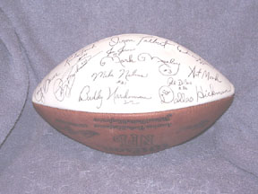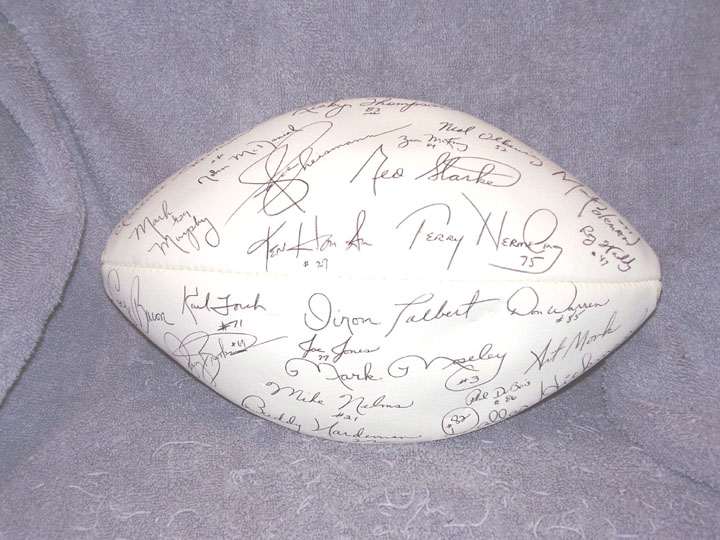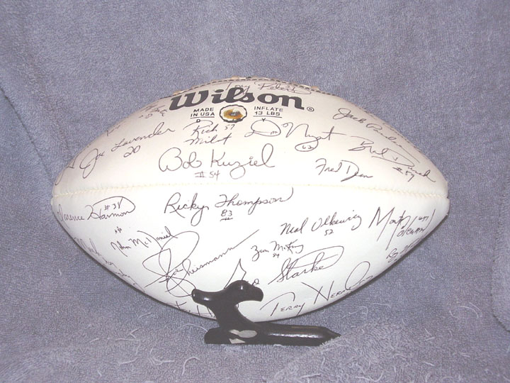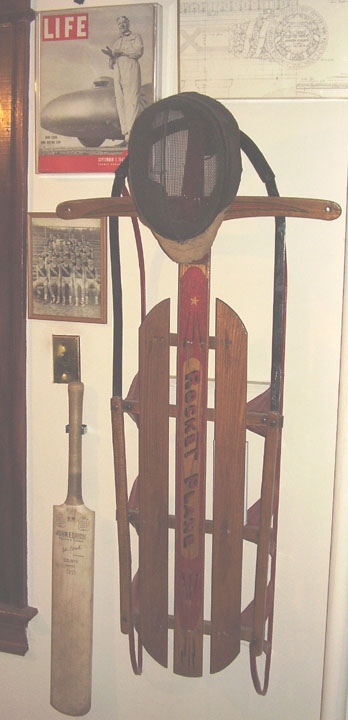 Hockey Memorabilia The Flying Fraction outside the Duquesne Gardens Ciccarelli (left) and Lemieux (right) Autographed sticks, Skates, Souvenir Puck Carved cocoanut head in catchers mask Plans for the Navion Model Airplane and framed letter from William Winter (click to enlarge) When the Pittsburgh Penguins were on their way to the Stanley Cup, I made a point of attending all their games played in DC. Occasionally, my work took me to Pittsburgh and I went to great lengths to see a game or to at the "Igloo" (aka the Civic Arena). I attended a charity function and was successful in bidding on a stick autographed by Mario Lemieux. I have my old skates, the Ciccarelli and Lemieux sticks and a souvenir puck from Pittsburgh's first Stanley Cup season on my office wall. (You'll also a carved cocoanut head wearing a catcher's mask -- that came from my Dad who made it while he was on Saipan during World War II.) Field HockeyField hockey is a lot like Ice Hockey except that it is played on a grass field (pitch) with a ball instead of a puck. Sticks are smaller and curved In the United States, Field Hockey is mostly the preserve of girls at swanky private schools. However, in other countries, it is a fairly rough and tumble sport played by men. Australia, India and Pakistan have historically been powerhouses in this game. In fact, a trip to Pakistan found me slugging it out with some colleagues on a pitch near Islamabad. My training in Ice Hockey paid off, although the game had a lot of similarities to Hurling as well, especially in the amount of contact. This is no game for weaklings or sissies, and you have to be in top physical condition, because it moves very fast and you are running all the time. I brought an antique stick home as a souvenir. Field Hockey Stick (click to enlarge) Games played with curved sticks and a ball have been found throughout history and the world. There are 4000-year-old drawings from Egypt. (Hurling only dates to before 1272BC.) There is a depiction from 500BC in Ancient Greece when the game was called "kerytezin" because it was played with a horn ("keryos" in Greek) and a ball-like object. In Inner Mongolia, China, the Daur people have been playing Beikou (a game similar to modern field hockey) for about 1,000 years. There were hockey-like games throughout Europe during the Middle Ages[citation needed] and the word 'hockey' was recorded in the Galway Statutes of 1527. If you'd like to know more about field hockey, check out the website of the World Hockey Association. American FootballI was always small and didn't play football in high school, although I was always up for a game of touch football, especially when it became fashionable during the Kennedy Administration. In general, my connection with Football has been that of a spectator. My Dad and I sat through innumerable losses by the Pittsburgh Steelers when they played at Forbes Field or Pitt Stadium, dismal days enlivened only by Bobby "Night Train" Lane and Eugene "Big Daddy" Lipscomb. My only football souvenir is a ball autographed by the 1978 Redskins, during the Jack Pardee era. It was offered at auction at a fundraiser for the Washington Opera (of all things). I think that I got it for $25, opera buffs not being big football fans... Candidly, I prefer Opera to Football, as well, since the sport has degenerated to "Our Overpaid Thugs Against Your Overpaid Thugs." The game has become so big, and so commercial (even at the college level) that no average kid can envision even hoping to play. That is, a normal kid can aspire to being a brain surgeon or President, but unless he weighs 200 pounds at age 11, he isn't going anywhere in Football. Redskins Autographed Football c. 1978 (top)Jack Pardee, Joe Lavender, Bob Kunziel (mid) Joe Theismann,George Stark, Diron Talbert (bottom) Mark Mosely,, Art Monk, Dallas Hickman (click to enlarge) This was a really great way to spend $25! Racquet SportsI have always been a fan of all racquet sports, including Ping Pong, Squash and Tennis. I attained some recognition in Squash during the 1960s and I still play today. ![]() Racquet Sports also, the Big Bang Carbide Cannon and the California Raisins... Click to Enlarge Moody Squash Racquet Starting in 1927, Helen Wills Moody got a five-year vice grip on major tournament titles. She was given the nickname "Little Miss Poker Face" for her methodical play and, reportedly, because she rarely smiled. her very famous name became associated with a line of very high quality racquet sport goods. Initially, they were targeted toward women, but the excellent reputation led the company to start a line of men's equipment as well. The company enjoyed a particularly good reputation in the sport of Squash Racquets. In the mid 1960s, I played squash at the Pittsburgh Athletic Club. I was given this racquet by a friend. It is the Moody Magma, well liked by enthusiasts for its exceptional stability, durability and control. The head is made of alternating layers of birch and beech and allows you to string the racquet very tightly, something that I prefer for getting topspin onthe ball. I used this racquet on the day that I won a lottery to play a game with Hashim Khan, possibly the worlds greatest ever Squah Racquets player. (I scored just one point, and I still cherish the ball from that game) Mr. Khan elevated the game from athletics to poetry. It was the thrill of a lifetime to be on the same court with him. You should really click here to learn more about the remarkable Khan family. Wilson "Don Budge" Tennis Racket: In 1938, American amateur Don Budge became the first player to win the singles title in the four major tournaments -- Wimbledon, French Championships, U.S. Nationals and Australian Championships -- in the same year. Writer Alison Danzig coined the term "Grand Slam" to describe Budge's feat. A steady force in men's tennis during the late 1930s, he made a comeback after a major World War II injury. Budge won his last title, U.S. Clay 