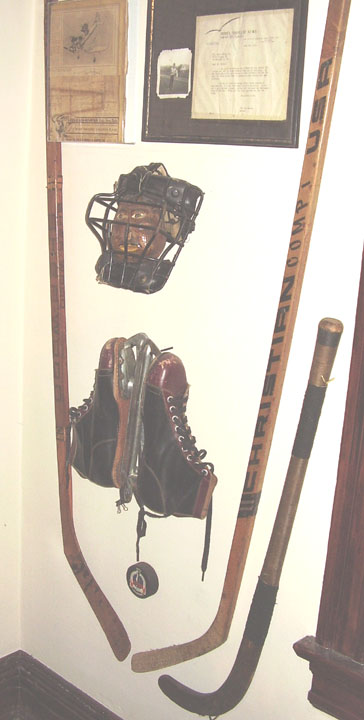 The Harry Gill Sports Company was founded in 1918 They were the Best, But they were Expensive (click to enlarge) Harry Gill was probably the greatest athlete of turn-of-the-century America, and probably the greatest track coach ever. Gill was thrust into the amateur track and field spotlight at the turn of the century when he easily defeated the three-time U.S. champion in the "all around"- an event equivalent to today's Olympic decathlon. Four years later Gill was hired to be the head track coach for the University of Illinois, a position that he held for some thirty years. During this time he organized (and won) the first NCAA track meet, his team won 19 Big Ten championships, and accumulated an impressive record of winning 111 meets out of 135. Although he never coached an Olympic track team, at the 1924 Paris Games, his men from Illinois outscored every other group of nations. Gill had become so dissatisfied with American equipment by 1918 that he started into production of his own, the first item being an ash javelin. It was so well-received that he expanded into other products, offering a full line of track and field equipment by 1922. His desire for excellence in competition led to a number of innovations and improvements in track equipment over the years. Gill Sports Equipment developed a flex test so that poles could be matched to the vaulter's weight, and an aluminum and brass alloy pole which allowed Bob Richards to be the only repeat gold medalist in the vault (1952 and 1956). Gill has several hurdle improvements to enhance safety that led to the first tubular steel hurdle. Revolutionary designs also include both the high-heeled starting blocks and those with adjustable pedals, and the Hollowood wood center discus that enabled Jay Sylvester to set two world records in 1968. Traditionally, the title of "World's Greatest Athlete" has been given to the man who wins the decathlon. This began when King Gustav V of Sweden told Jim Thorpe, "You, sir, are the World's Greatest Athlete" after Thorpe won the decathlon at the Stockholm Olympics in 1912. The current holder of the title is American Bryan Clay, the gold medal winner of the event at the 2008 Beijing Olympics, who took the title from Athens Olympics champion Roman Šebrle. Ice HockeySince I grew up in Pittsburgh, I didn't have a whole lot of opportunity to play hockey. Occasionally, a large pond at North Park would freeze up pretty solid and we would go ice skating. On occasion, guys from more northerly states would bring hockey sticks and we'd bat the puck around. Pittsburgh had a minor league hockey team (the Hornets) who would play at the old Duquesne Gardens downtown. Since this was accessible by streetcar, it was possible to attend day games when school was out. I like hockey a a spectator sport, but it is also a lot of fun to play. When I was a freshman at Carnegie Tech, a group of enthusiasts tried to start a team. The Institute was not big on athletics and the team floundered because the Gardens could only give us rink time on an intermittent basis. As I recall, we played a game or two against a ritzy suburban high school that had access to a skating rink. We got clobbered. The best part of the endeavor was the times that we got to skate with the Hornets. The great goalie Clyde Ciccarelli signed my stick.